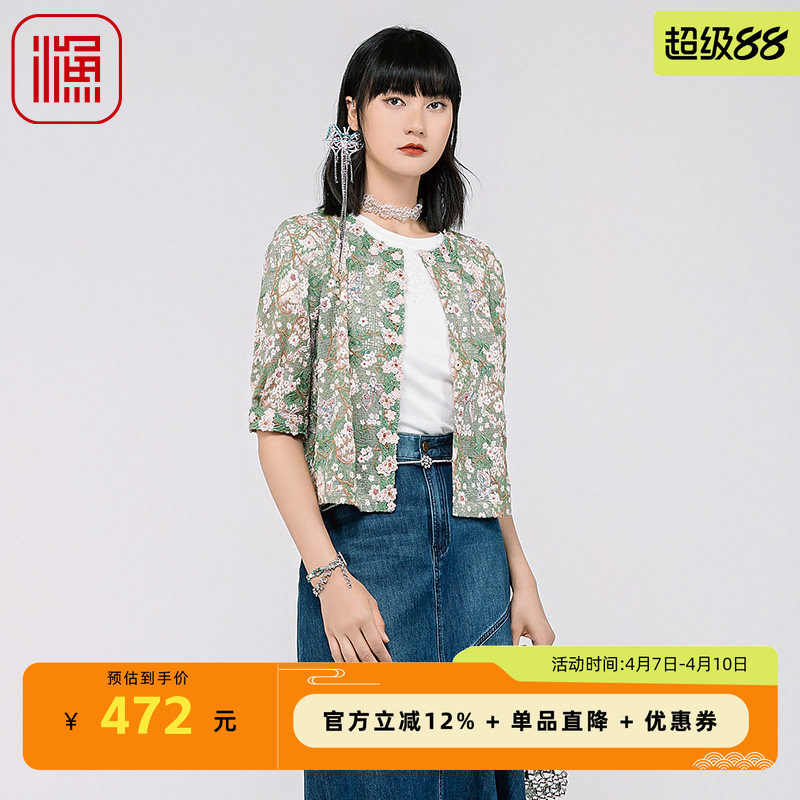 渔服饰国风女装2024新款网布满身绣花圆领中袖短款外套女FGGB3052