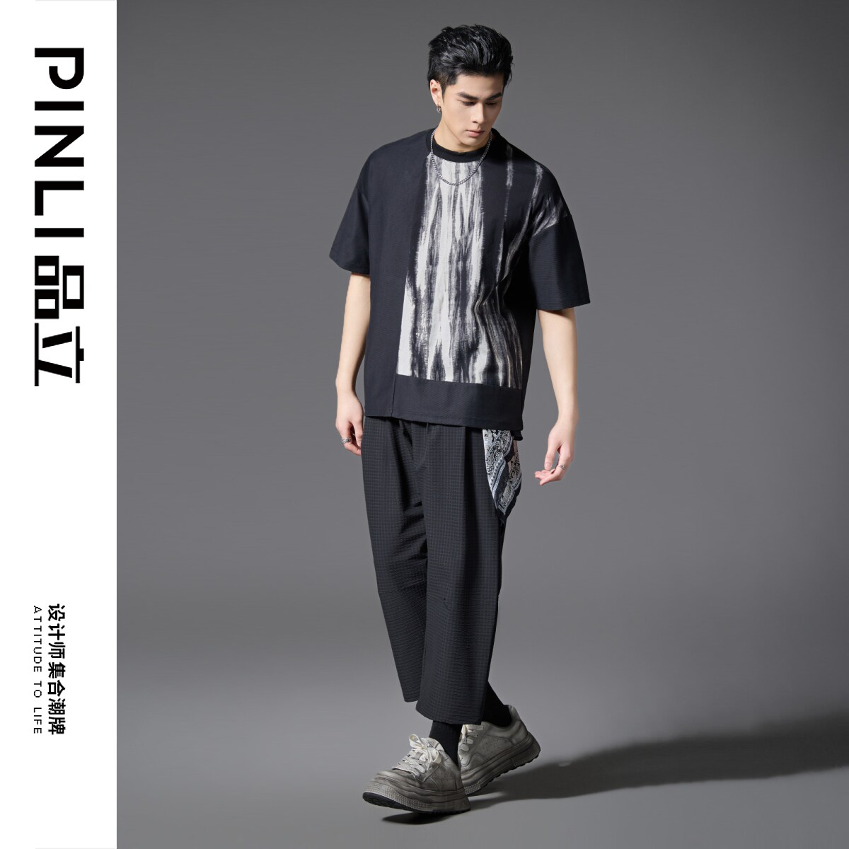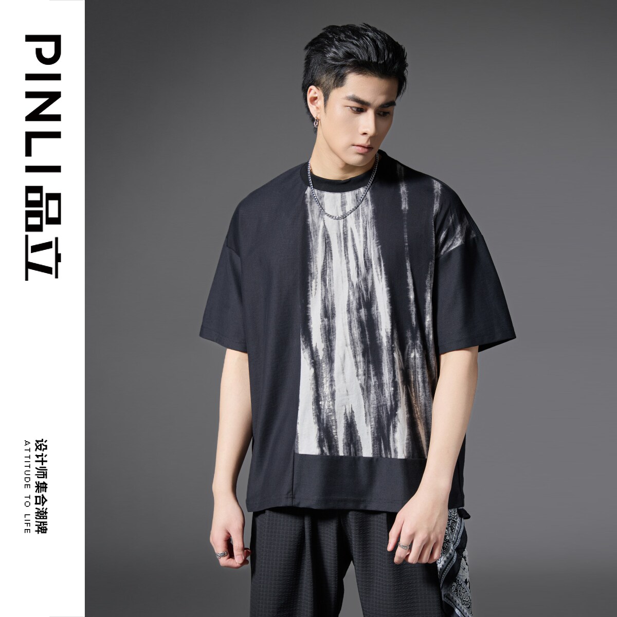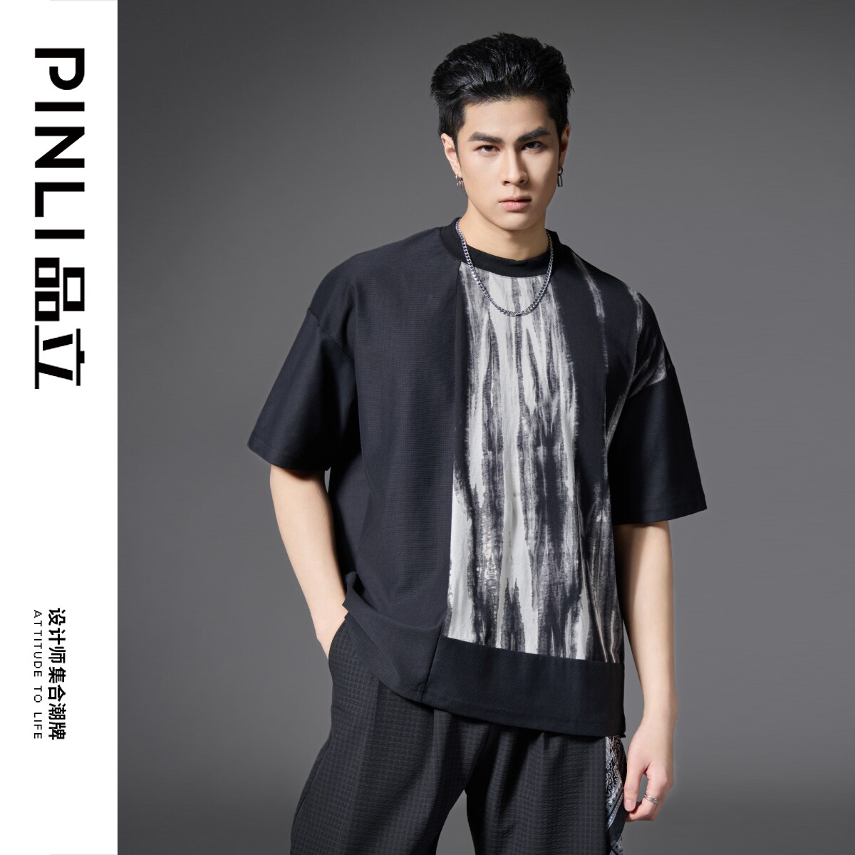 --------------------- PINLI品立2025春夏新款水墨印花拼接短袖T恤男士国潮宽松休闲上衣 【原售价】119元 【现售价】92元 【推荐理由】