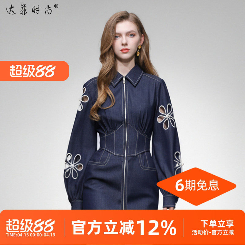 淘宝2026春季新款时尚千金风设计感镂空绣花灯笼袖收腰直筒牛仔连衣裙