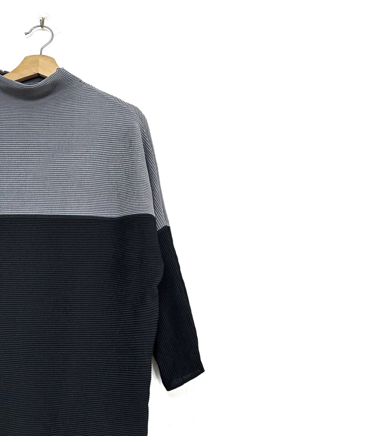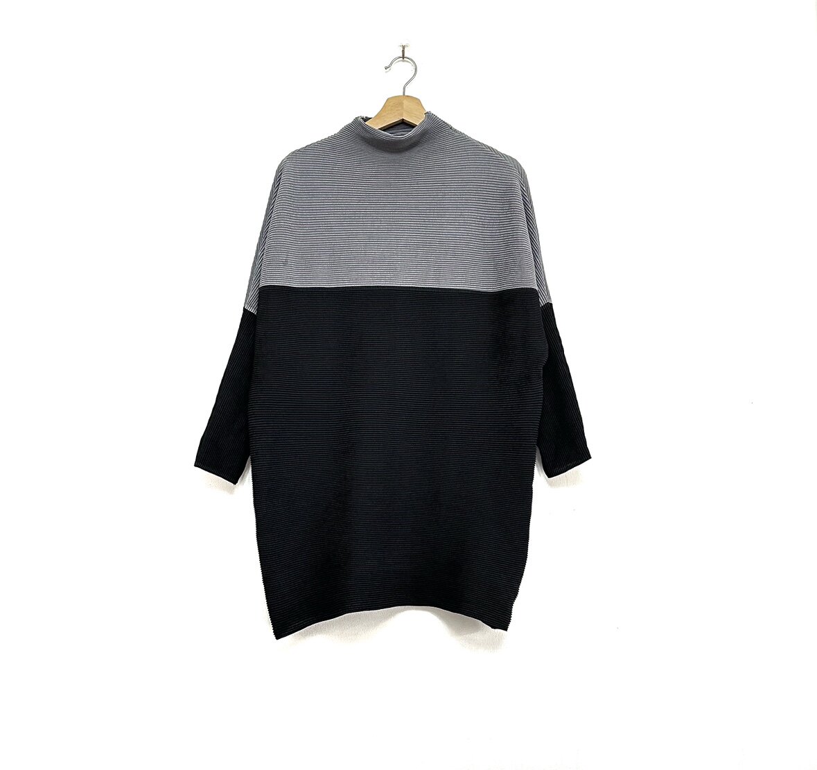 圣迪折扣女装 黑灰拼接撞色个性廓形蝙蝠袖肌理折痕宽松半高领T恤