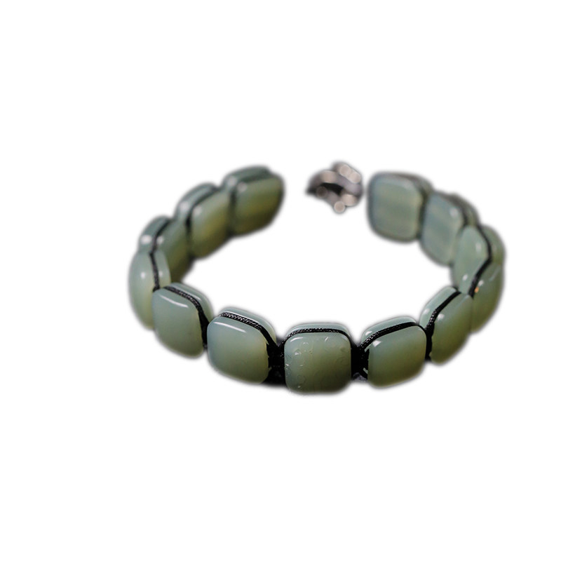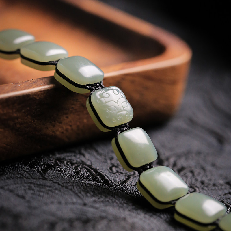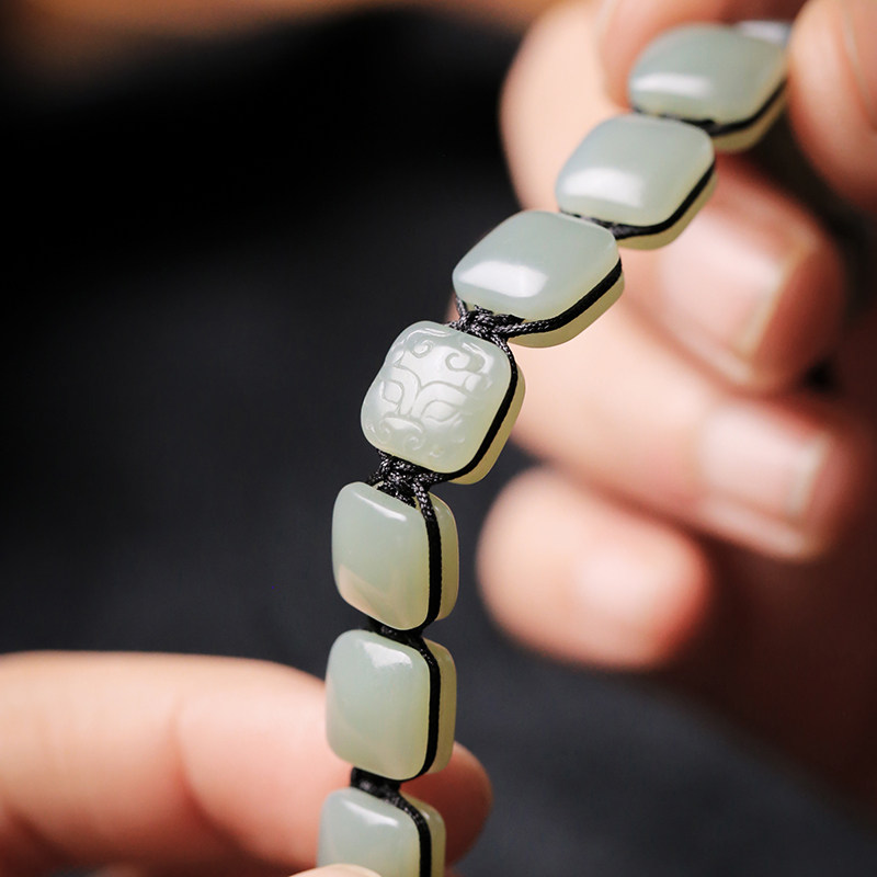山海攻器和田玉碧玉粉青白玉饕餮纹方形手链男女士国潮礼物定制