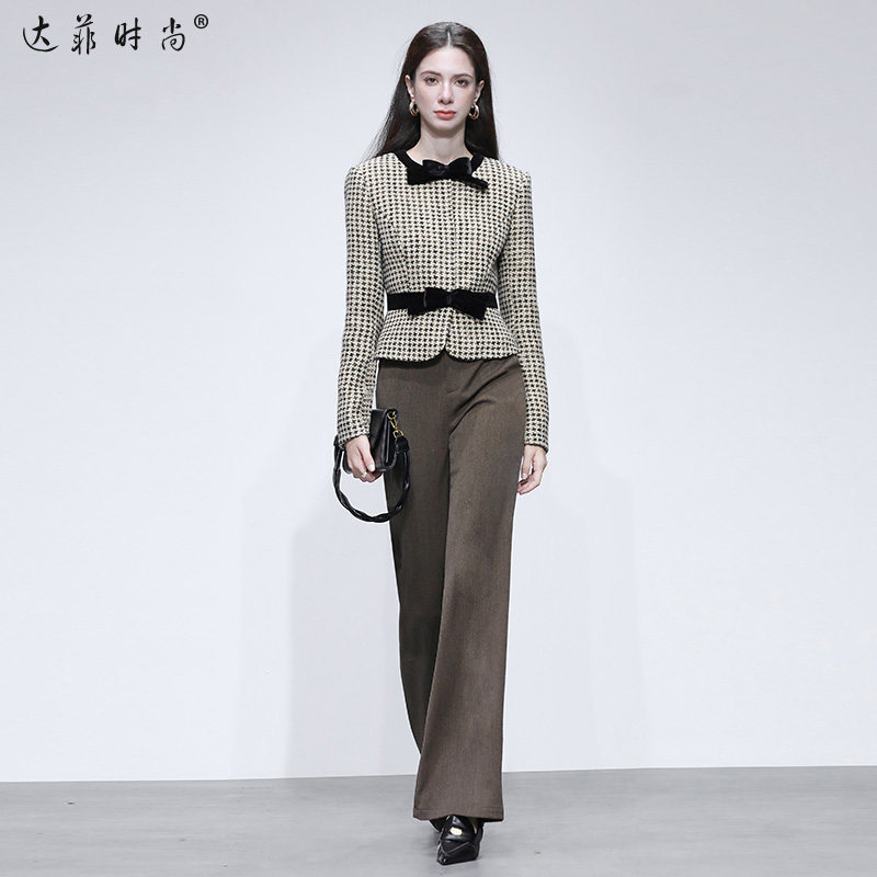 W2026春季新款小香风撞色蝴蝶结千鸟格花呢外套气质千金短外套女