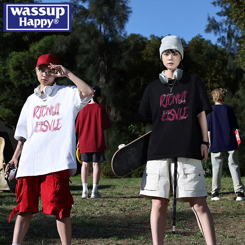 wassup happy短袖t恤男2025夏季新款高街重磅上衣服宽松休闲半袖
