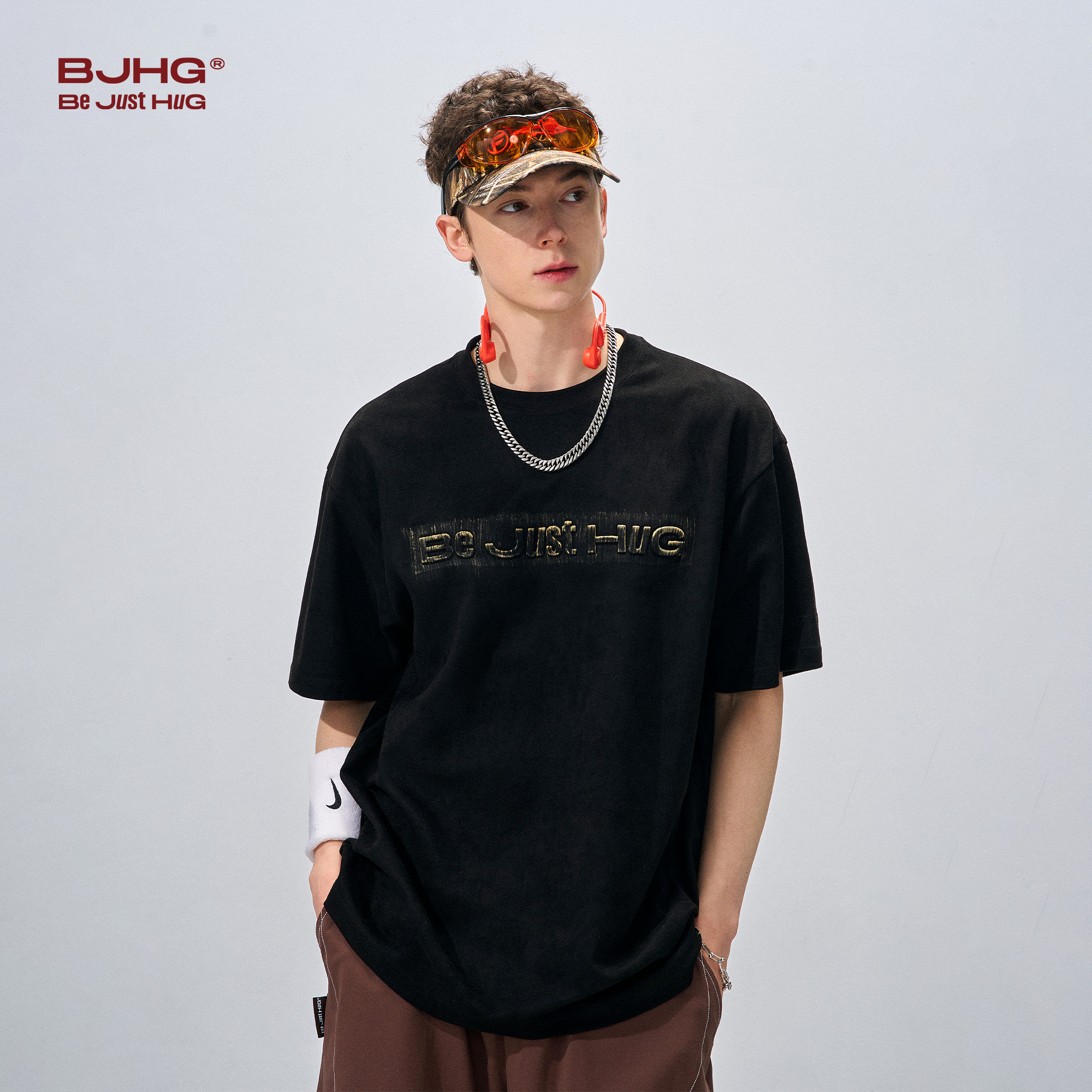 BJHG不计后果字母涂鸦短袖t恤男款夏季潮美式复古环保麂皮绒半袖