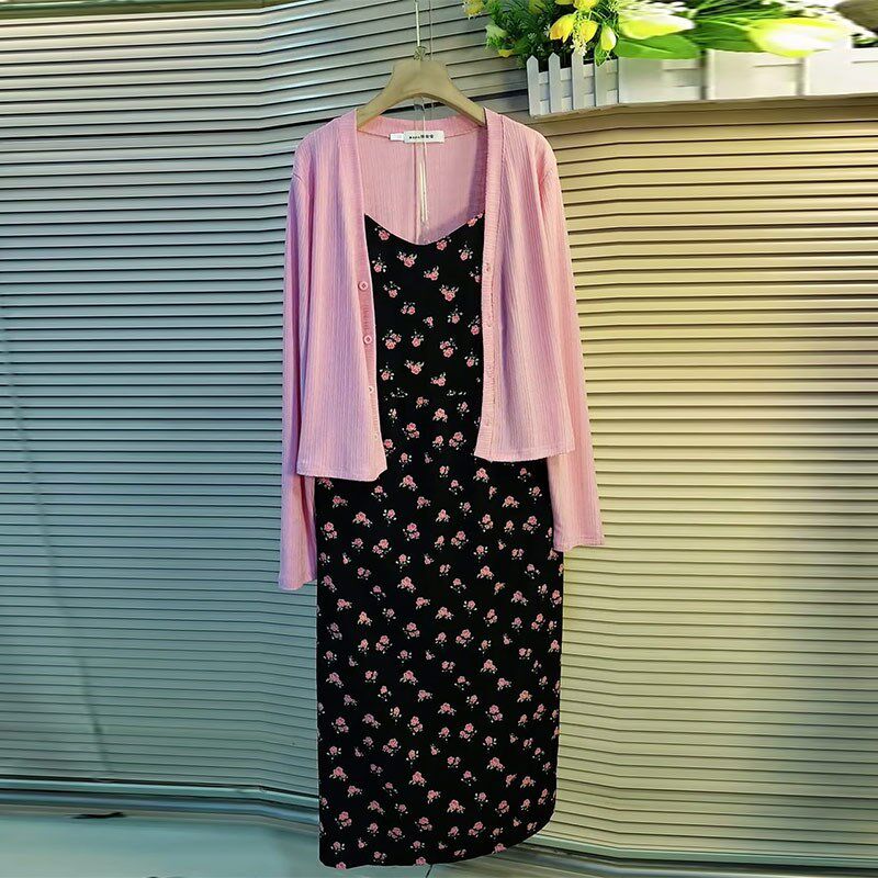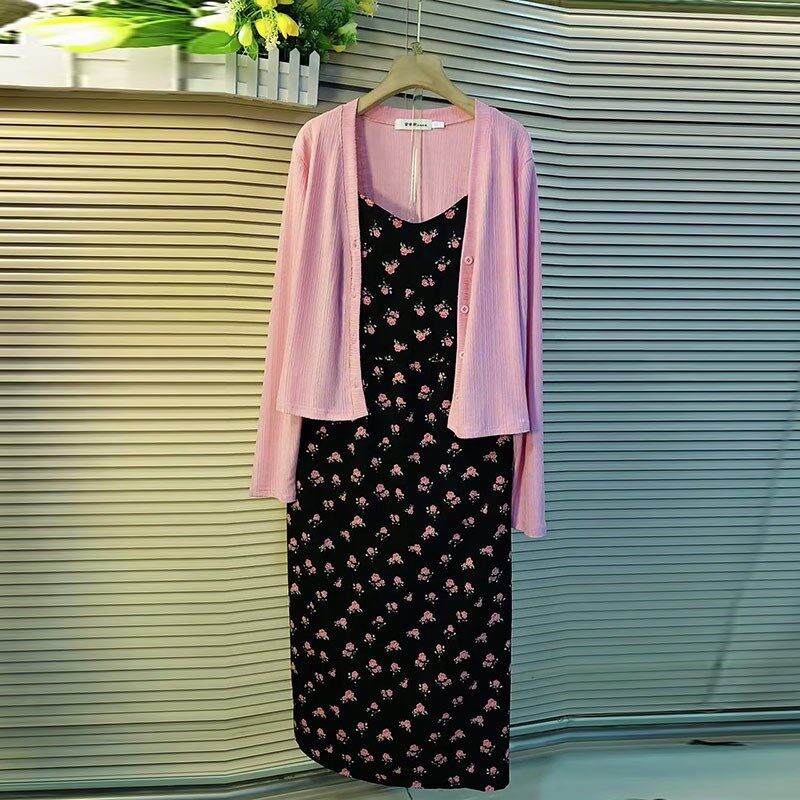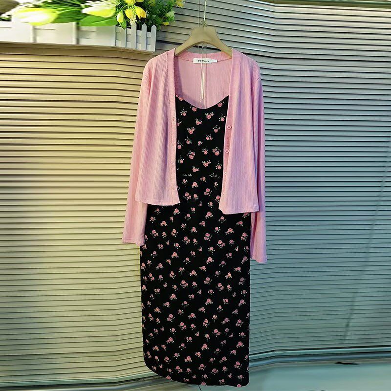 淘宝大码女装长袖净版外搭碎花吊带裙粉外套胖MM气质轻熟风洋气两件套