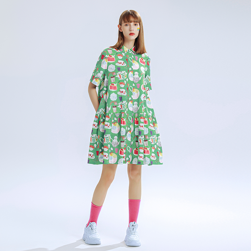 HEART IDEA原创设计师趣味手绘印花衬衫连衣裙女抽褶荷叶边中长裙