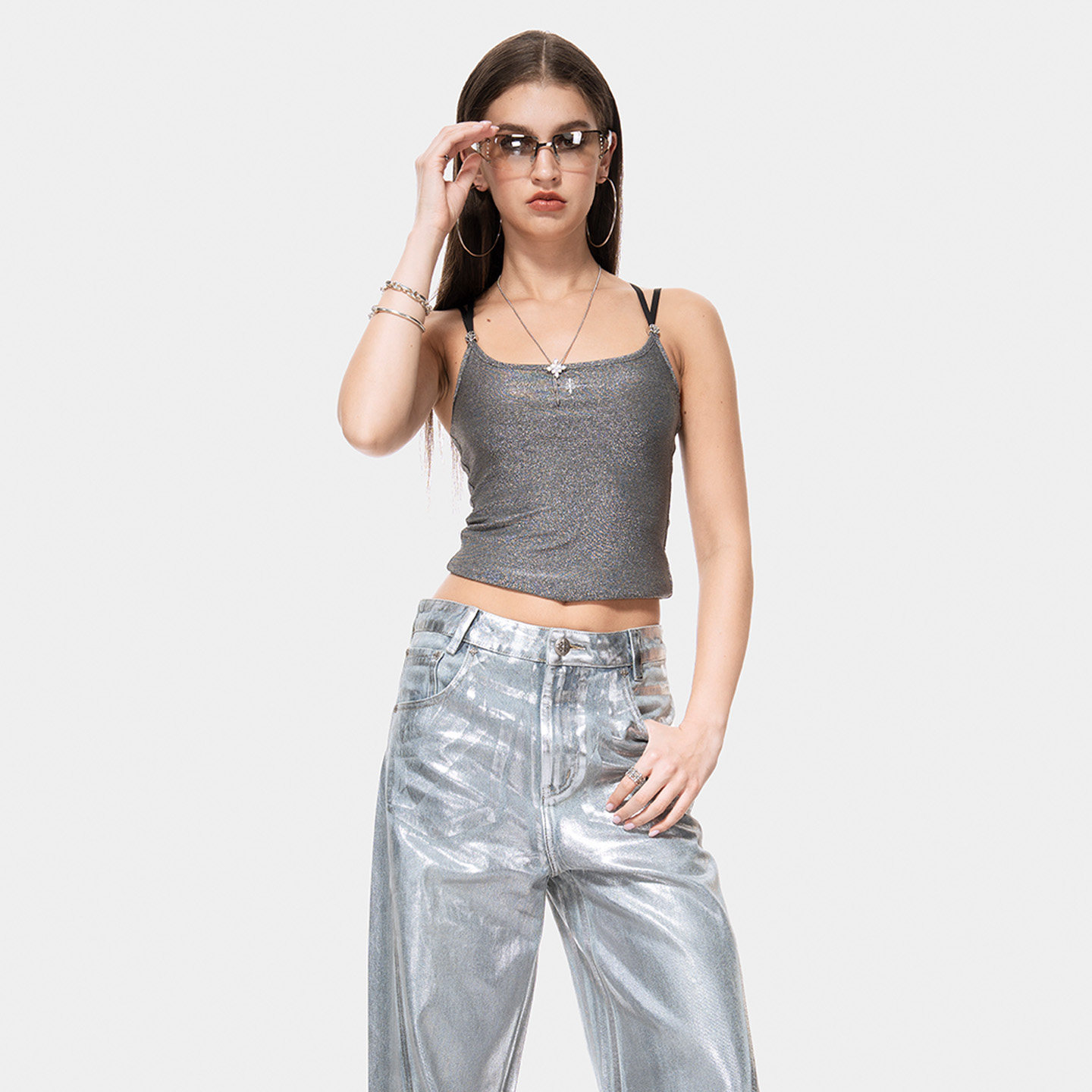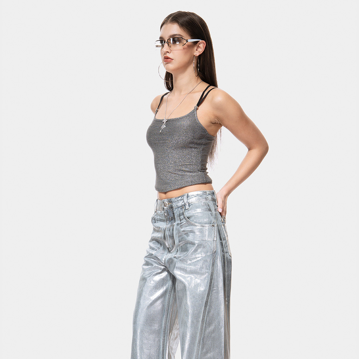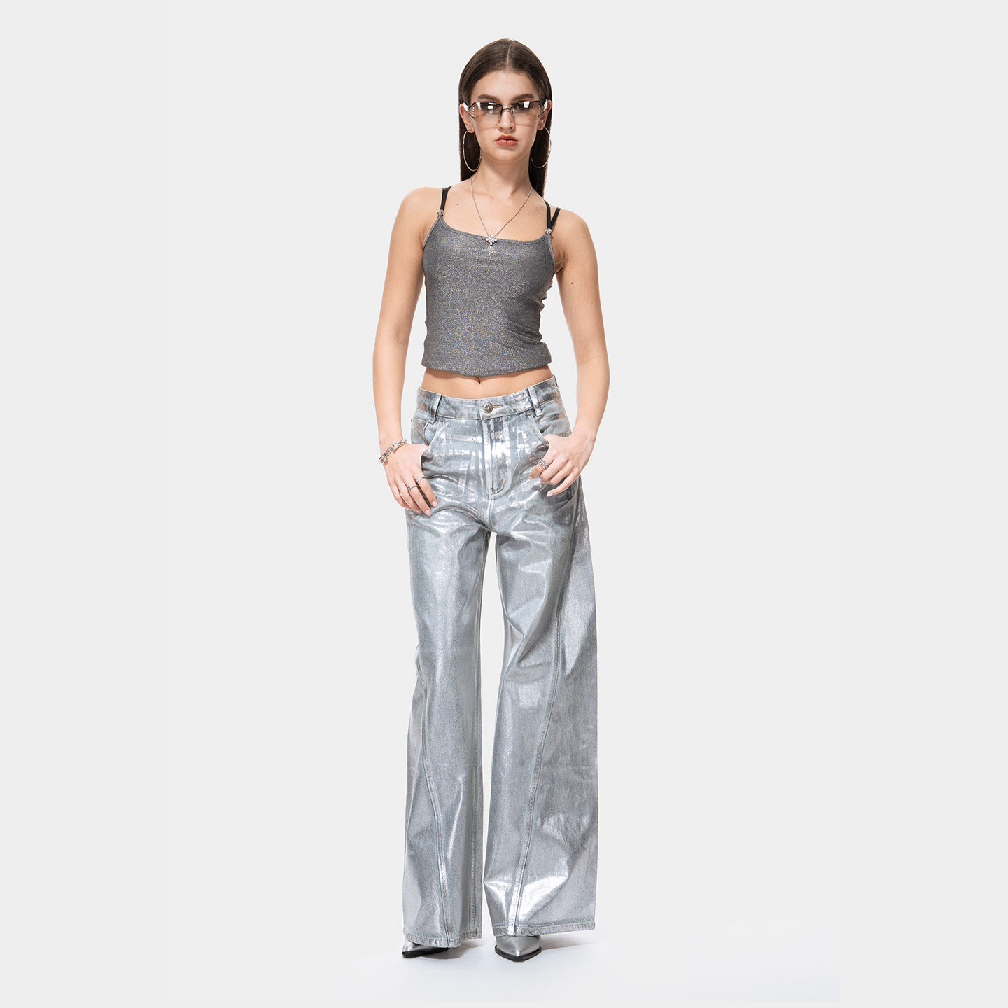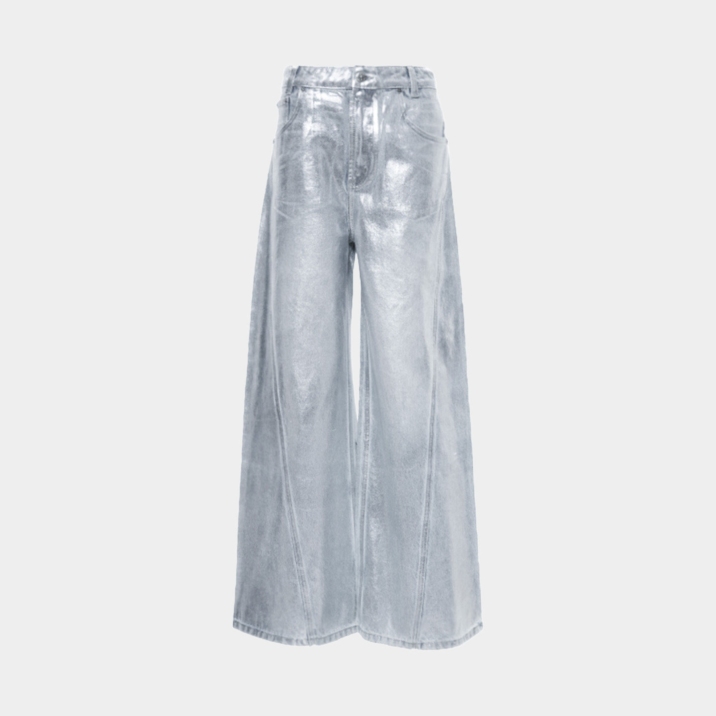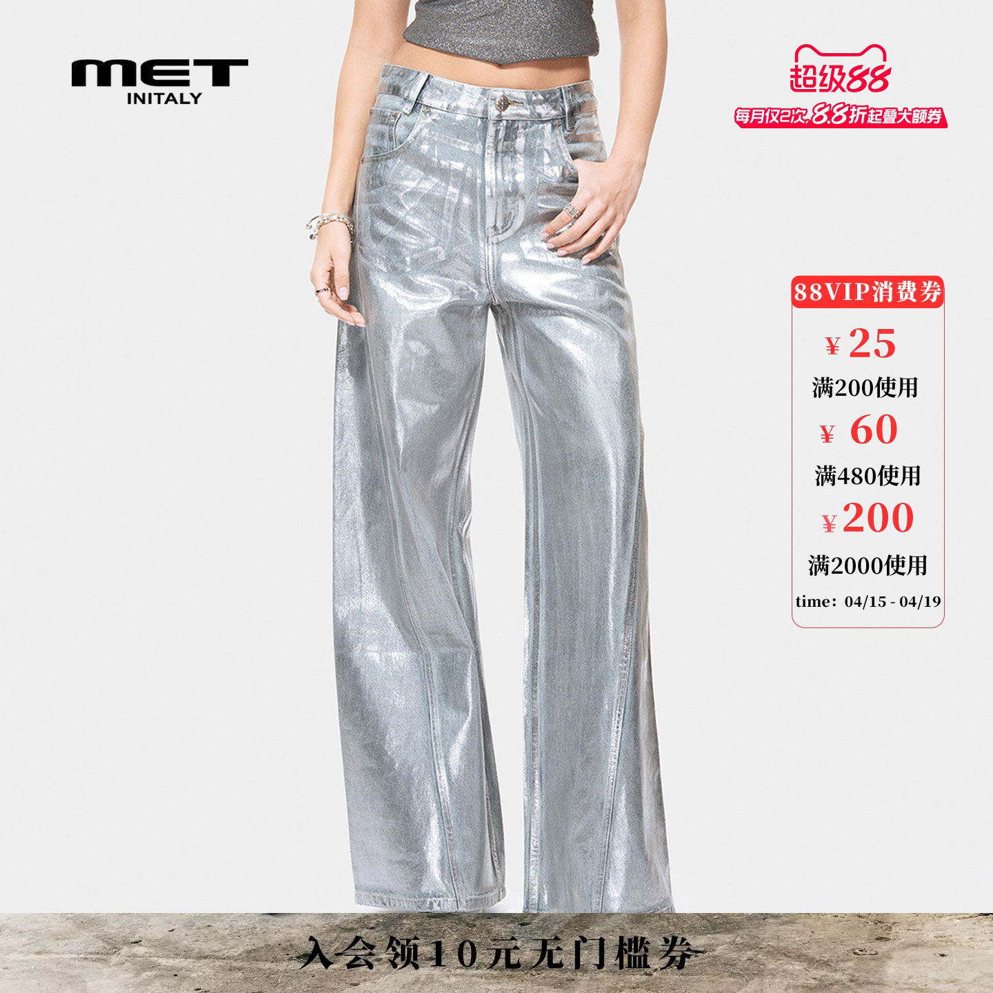 MET initaly复古银色阔腿牛仔裤女早春新款低腰显瘦直筒长裤