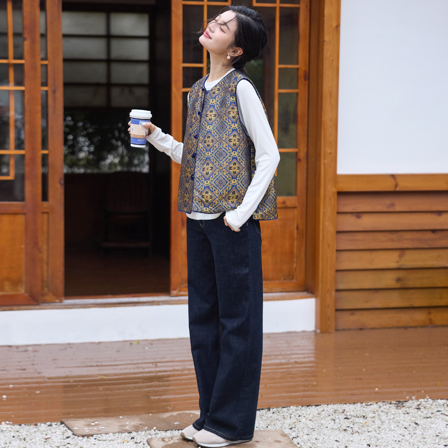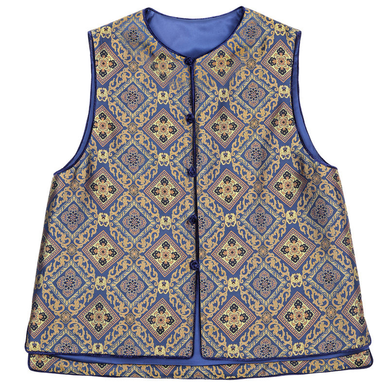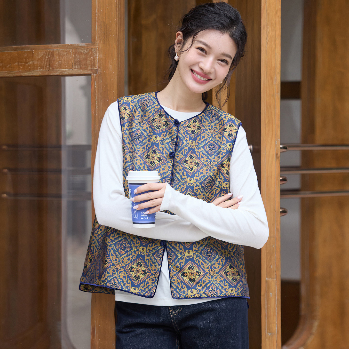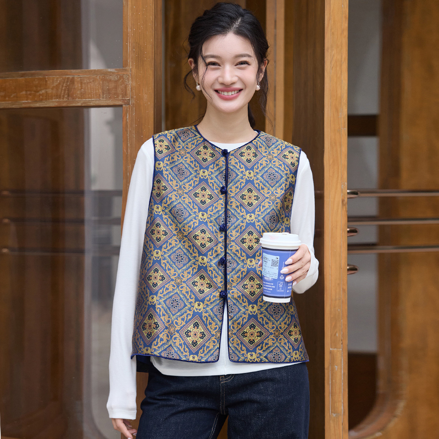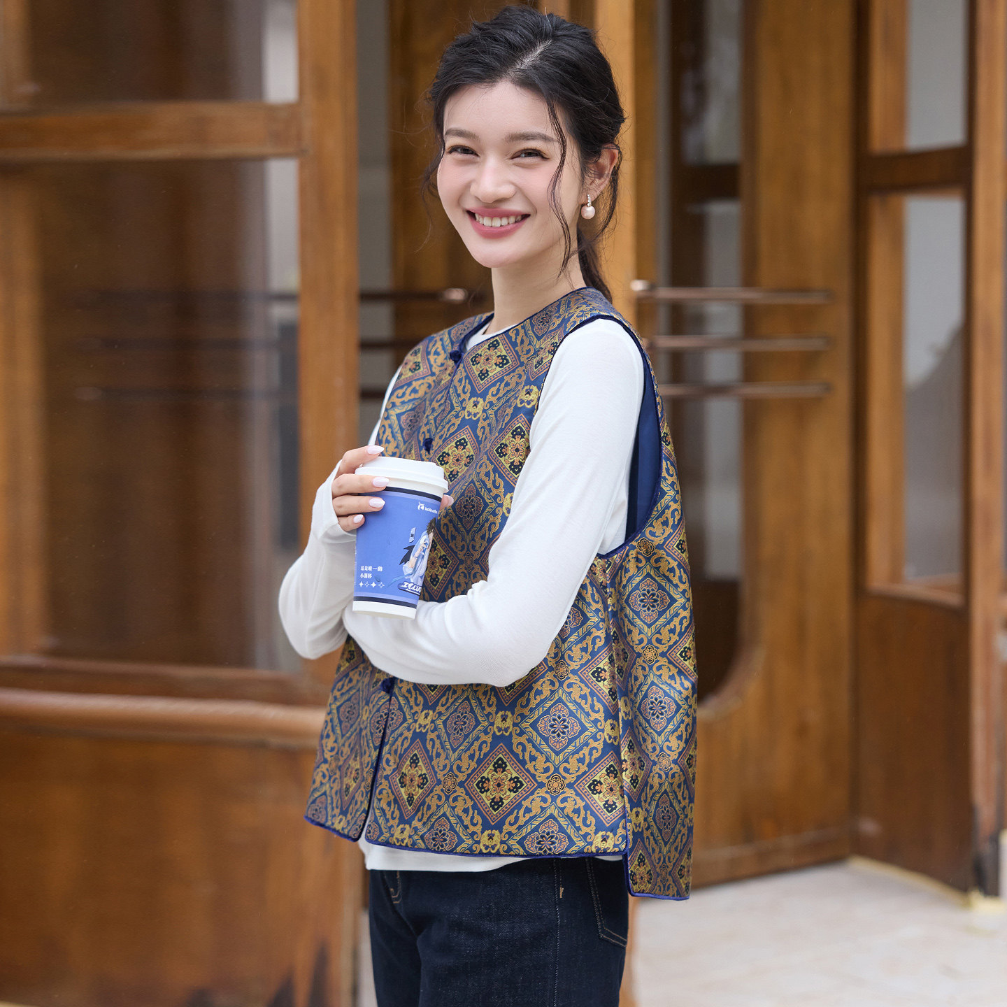 菲伊唐中式国潮复古改良真丝蜀锦对襟百搭圆领中式宽松马夹女上衣
