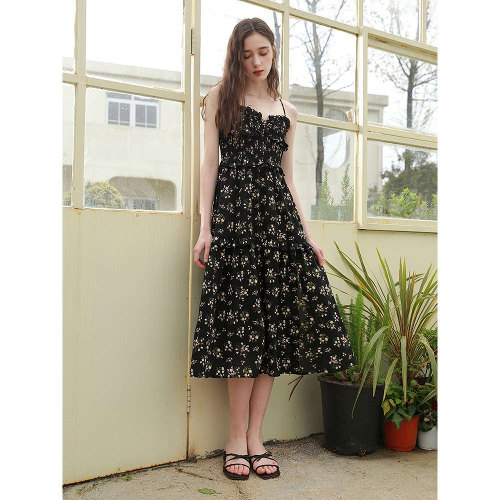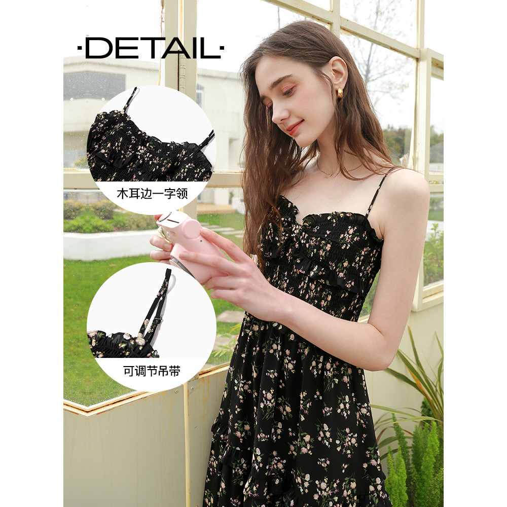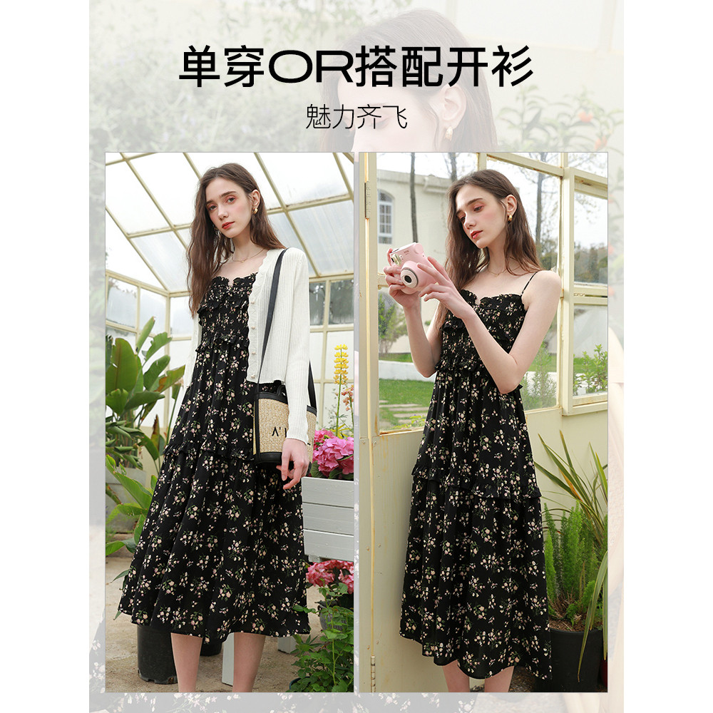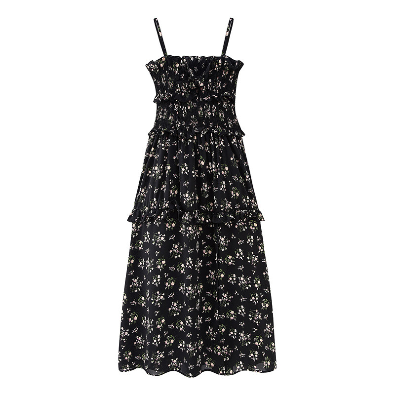 淘宝非实拍夏季新款黑色碎花吊带裙一字肩雪纺连衣裙显瘦中长裙子
