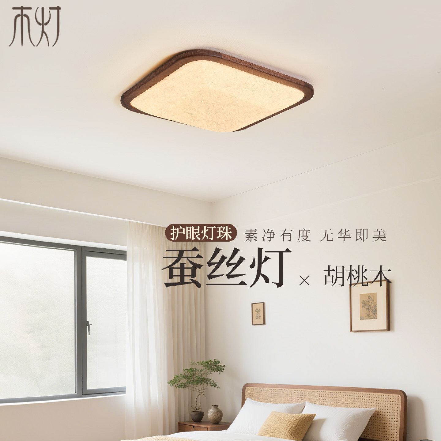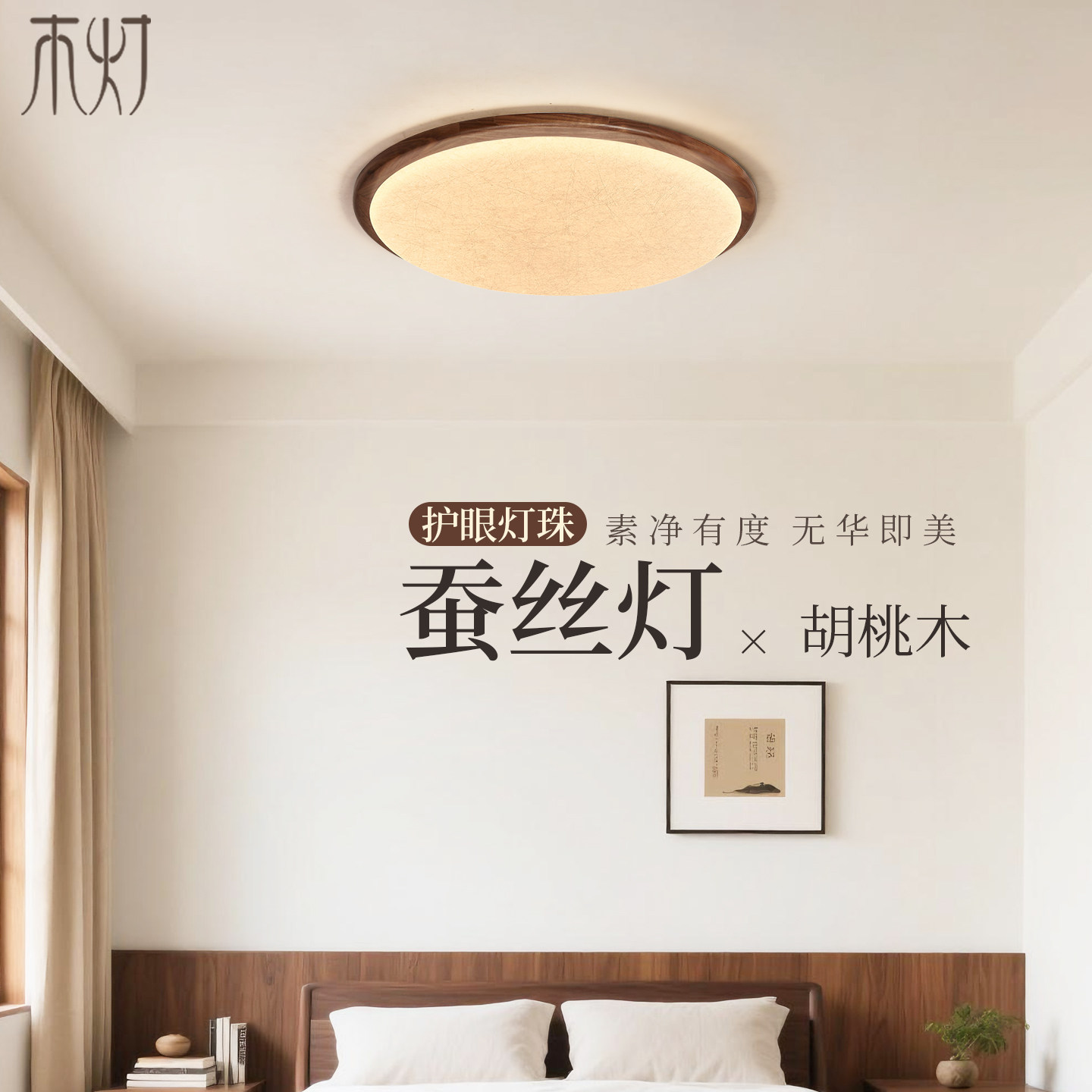 简约吸顶灯胡桃木蚕丝宋式美学客厅大灯新中式中古风卧室餐厅顶灯