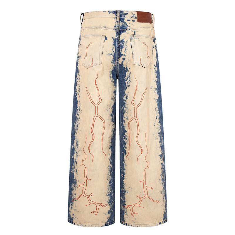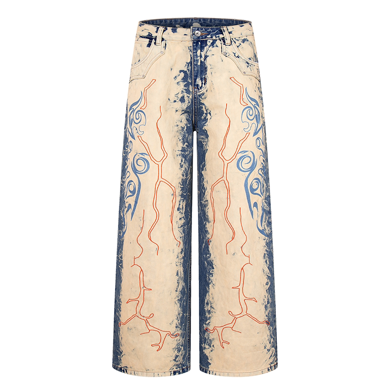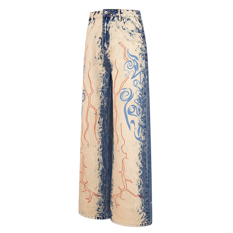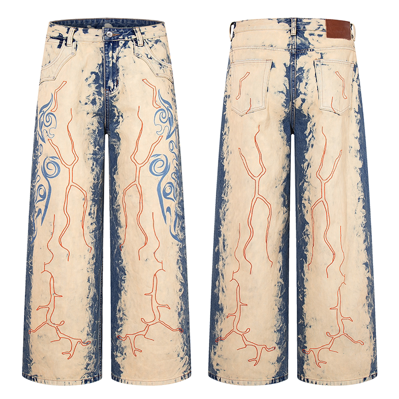 巴黎风美式渐变刺绣阔腿牛仔裤男做旧水洗高街潮牌长裤国潮直筒裤
