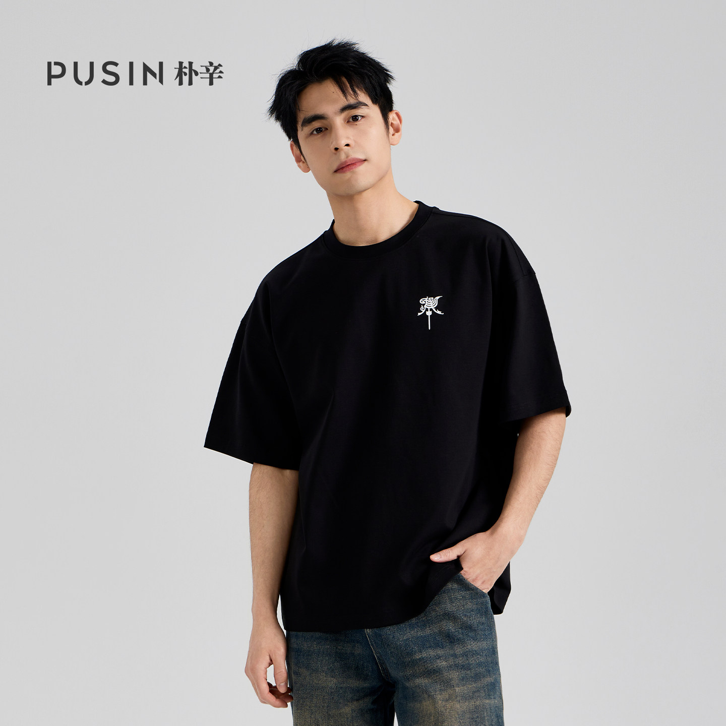 PUSIN朴辛宽松重磅短袖t恤隼字印花男女同款夏季新款黑白半袖上衣