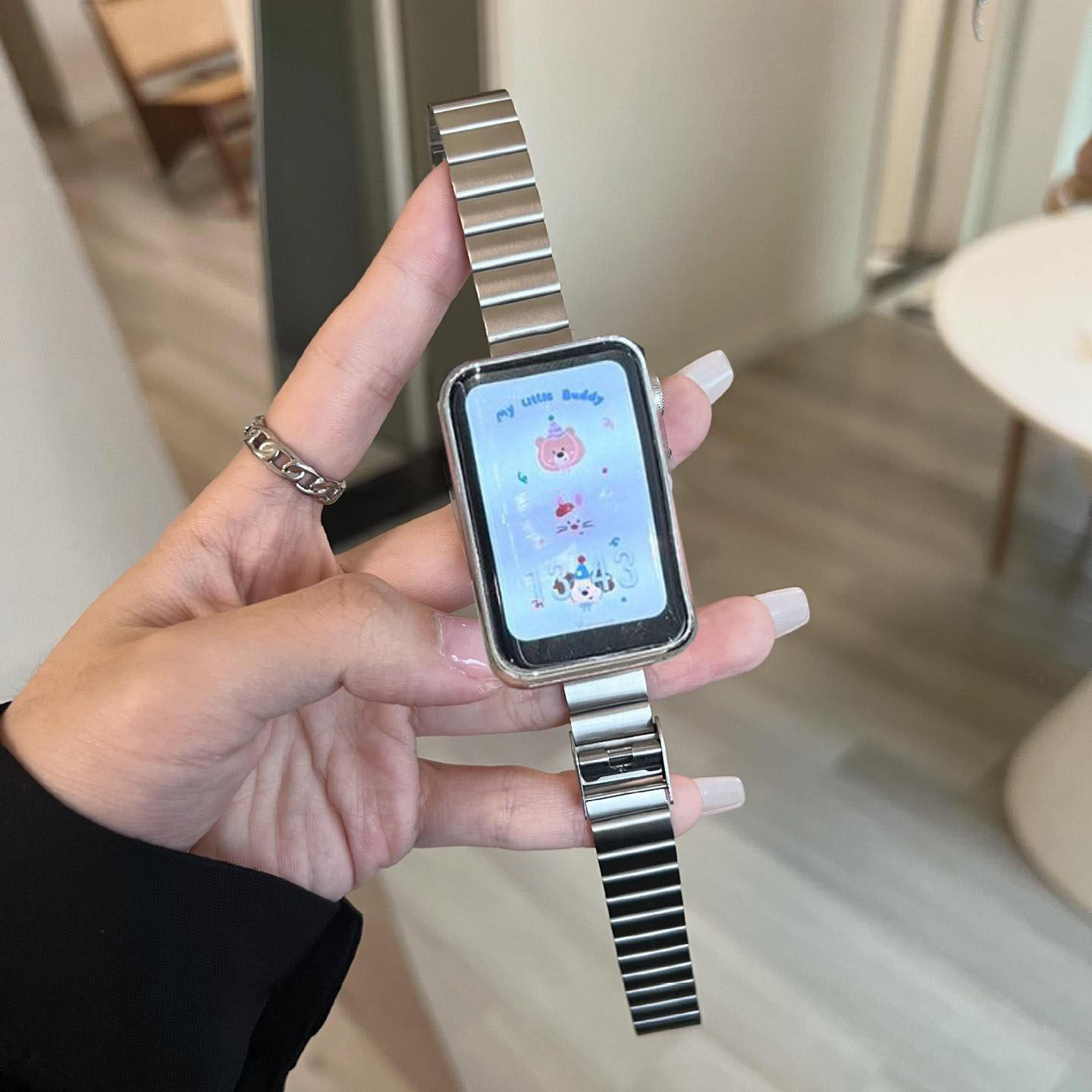 适用华为手环9/8表带金属扣款8/10一珠弧面竹节不锈钢片带NFC腕带