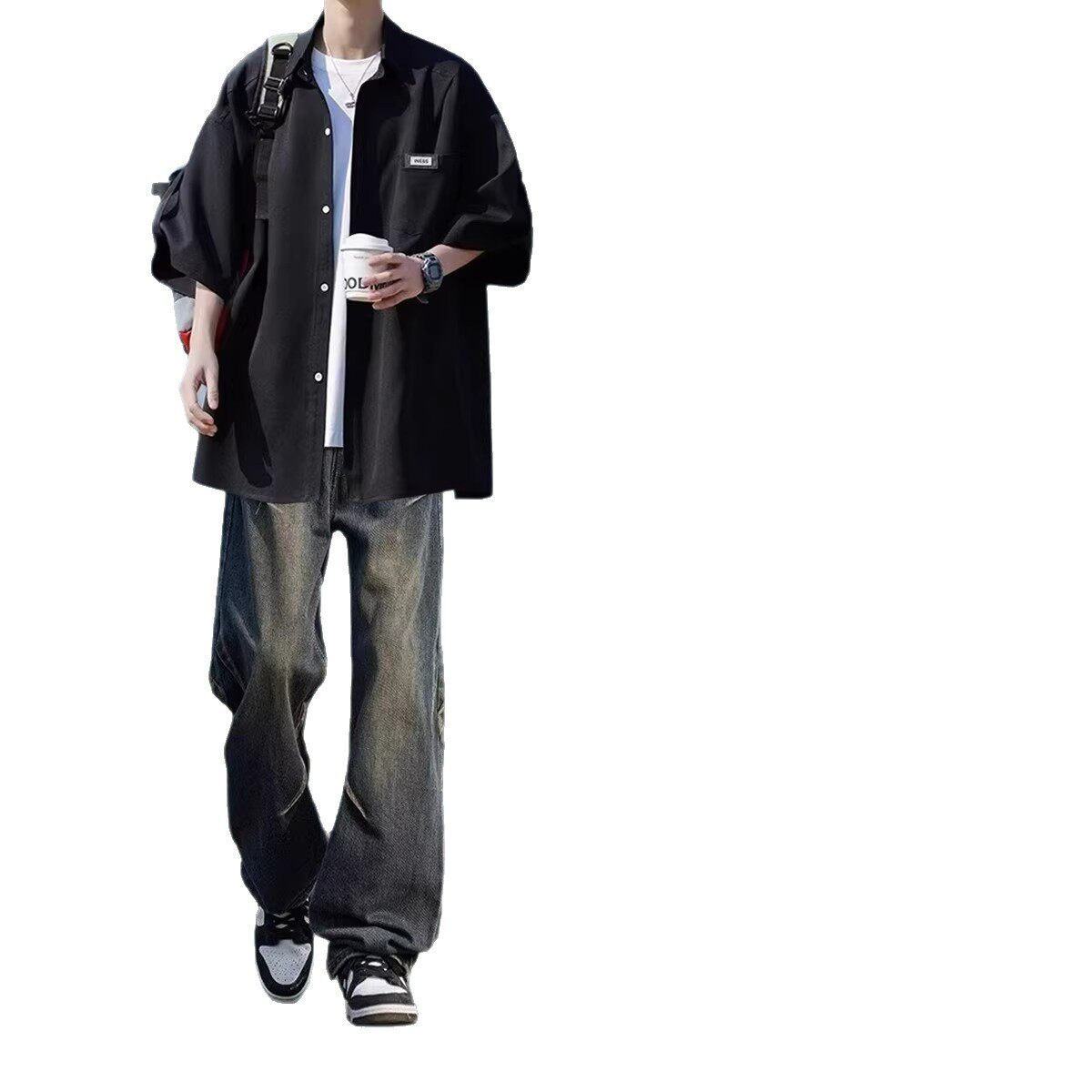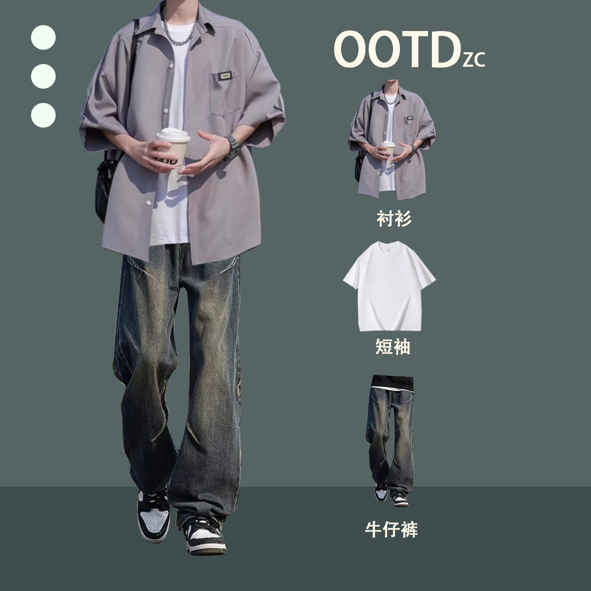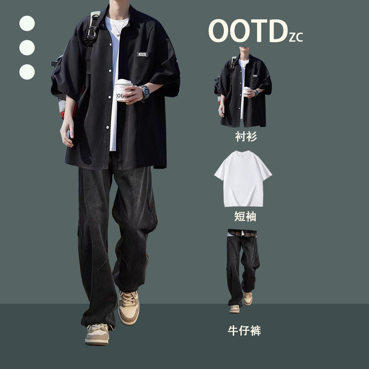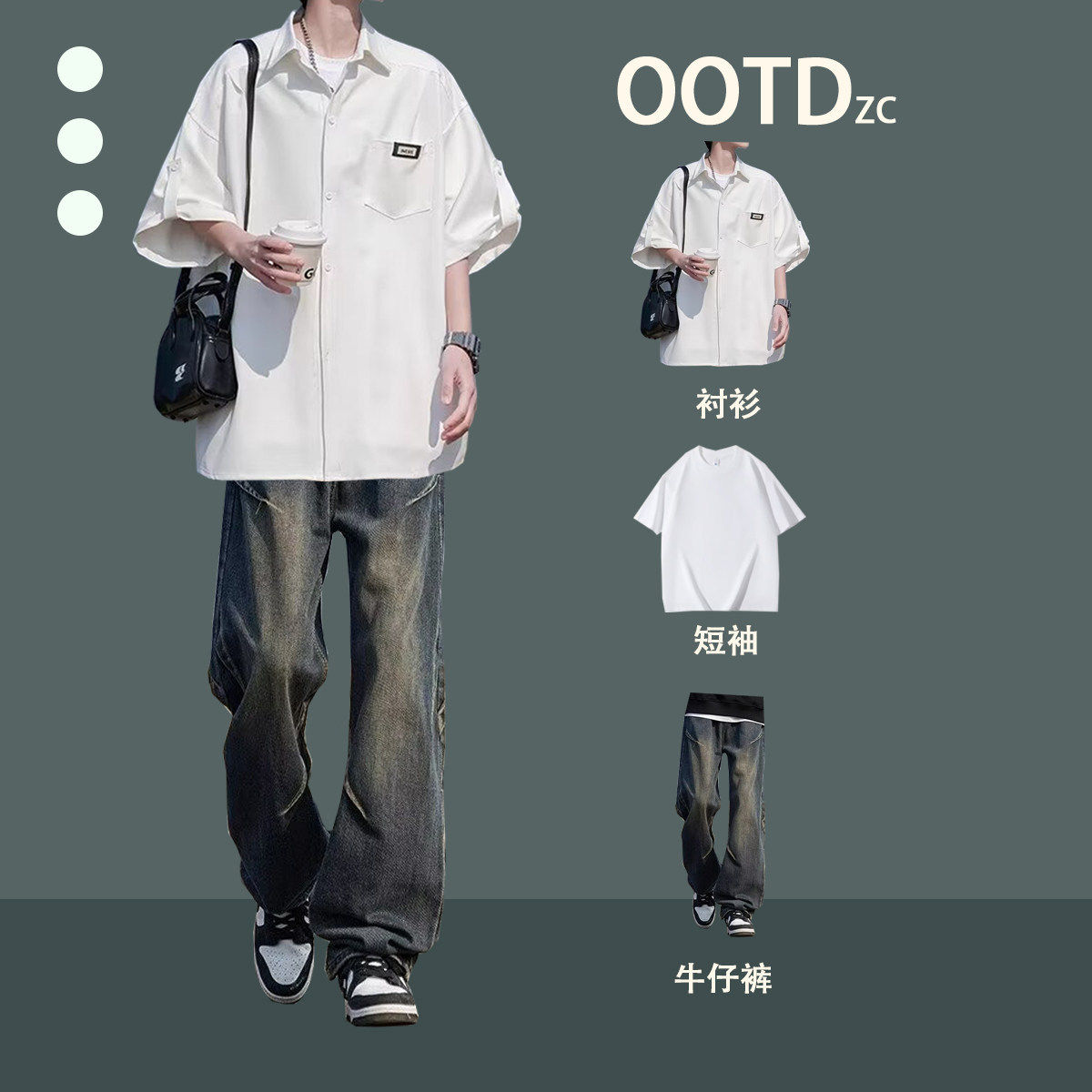 BENTIDEA 夏季衬衫大学生港风帅气三件套男生休闲时尚牛仔裤青年
