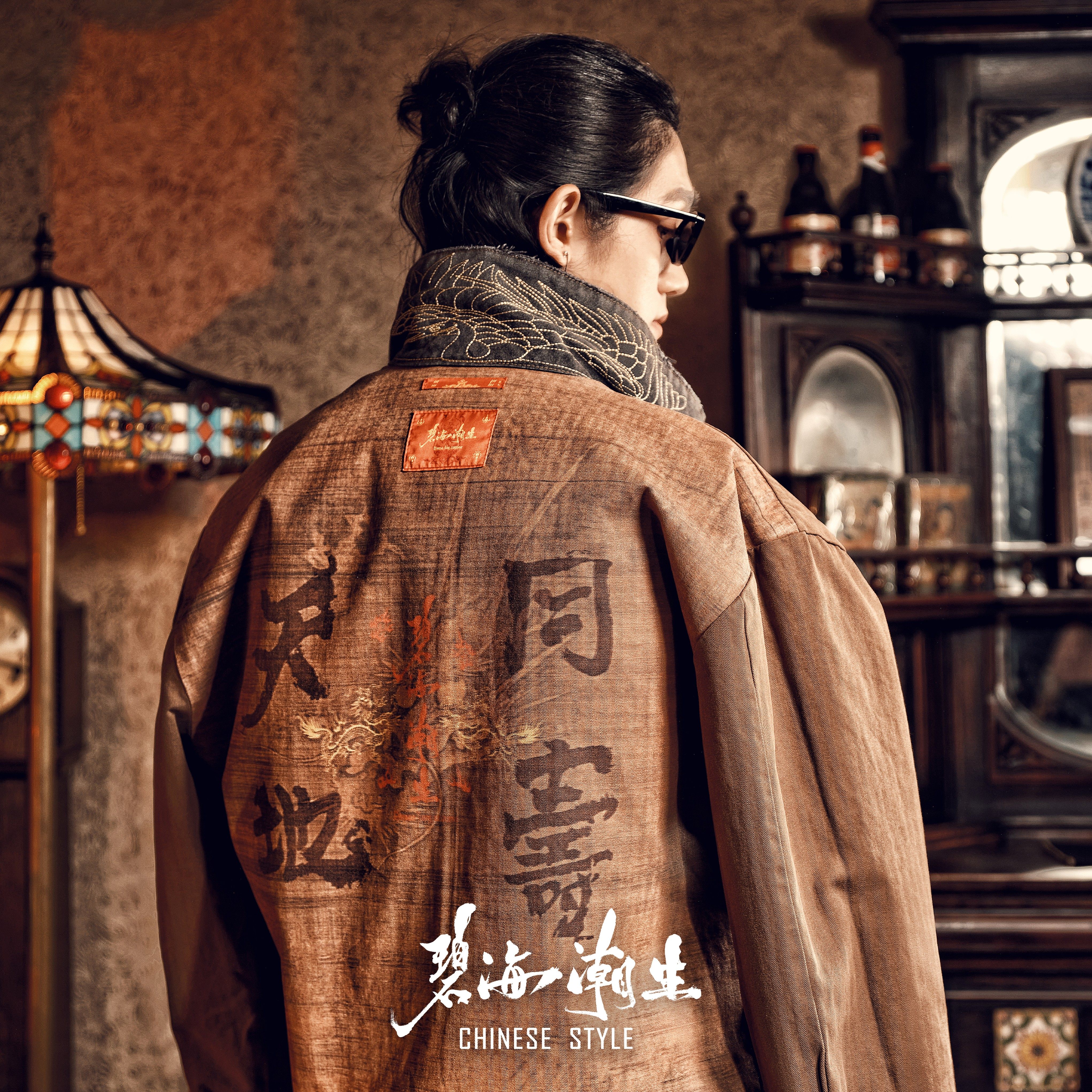 碧海潮生【天地同寿/棕】秋冬新款中国风国潮印花水洗夹克外套