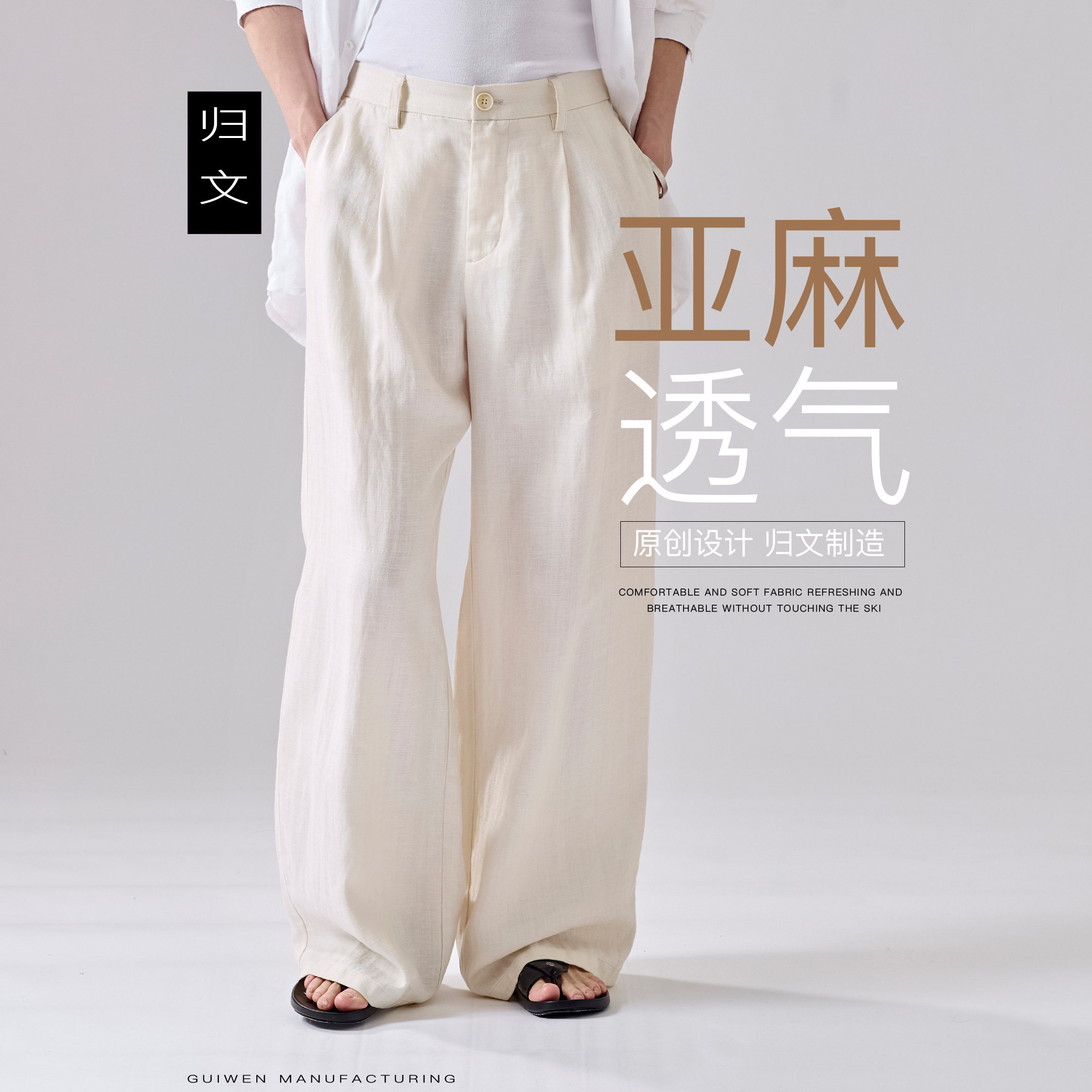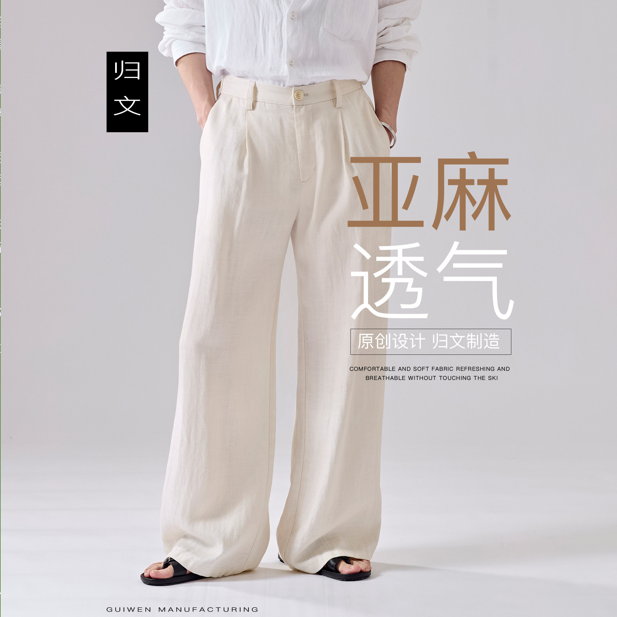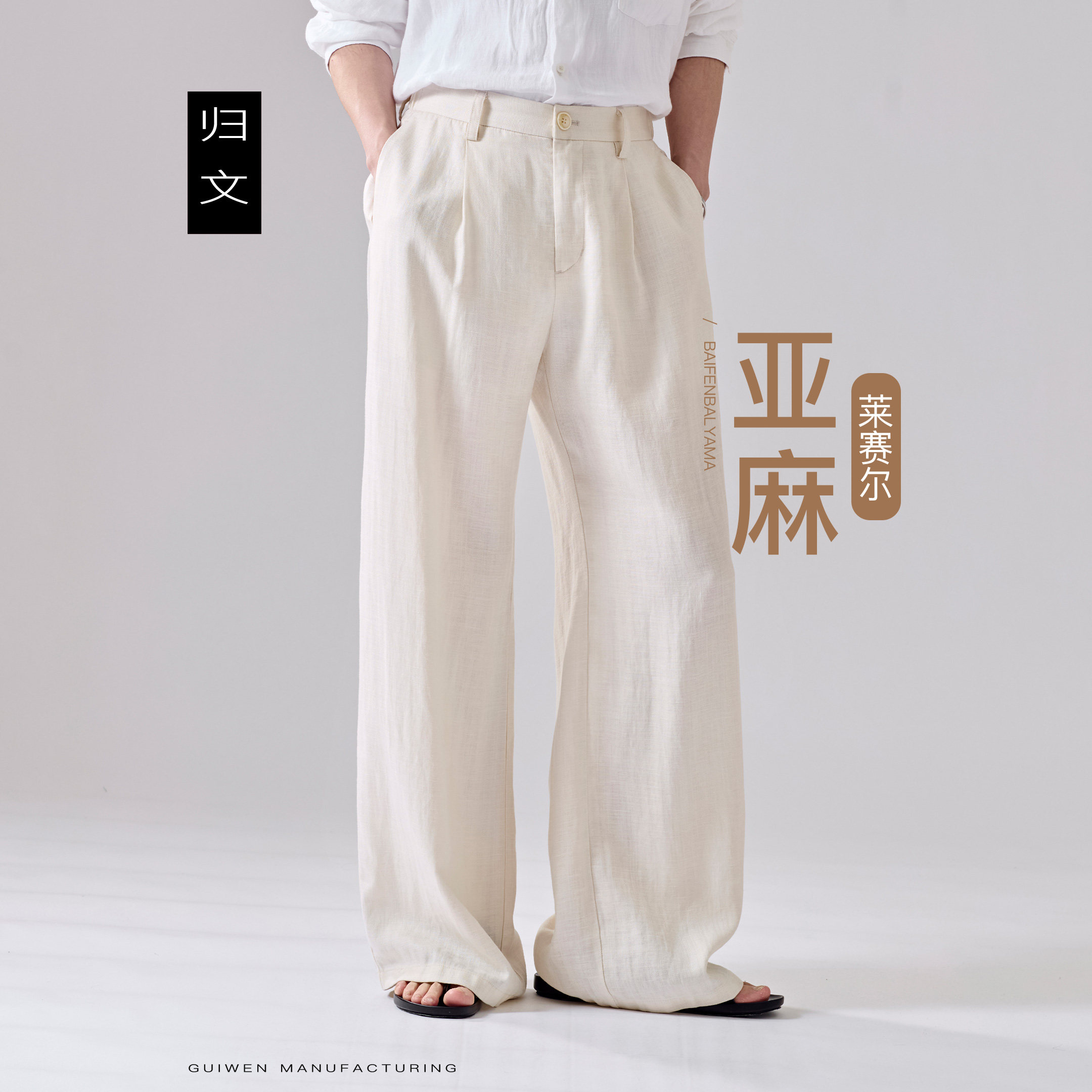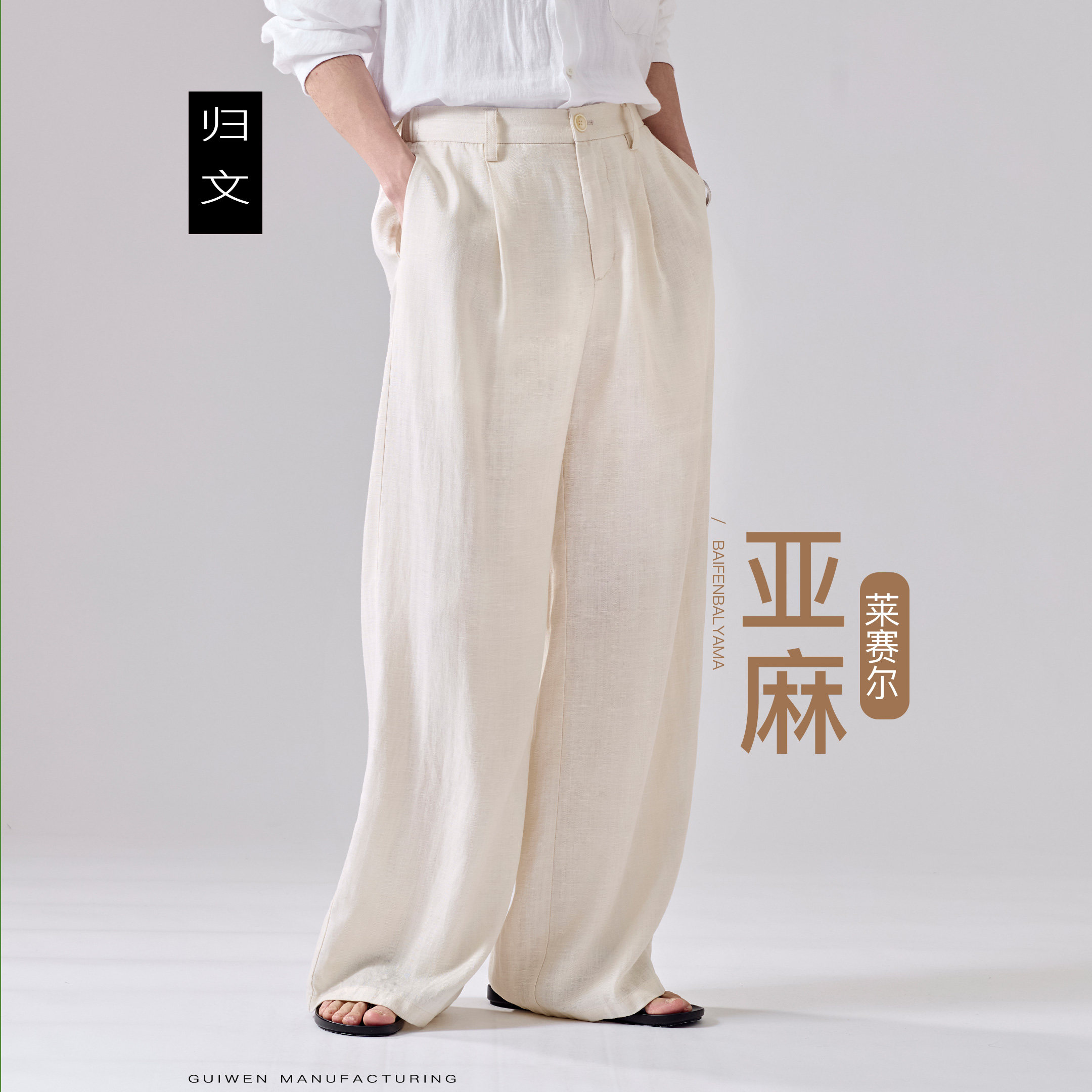 莱赛尔亚麻阔腿裤男夏季透气宽松直筒老钱风极简高级感浅米西裤
