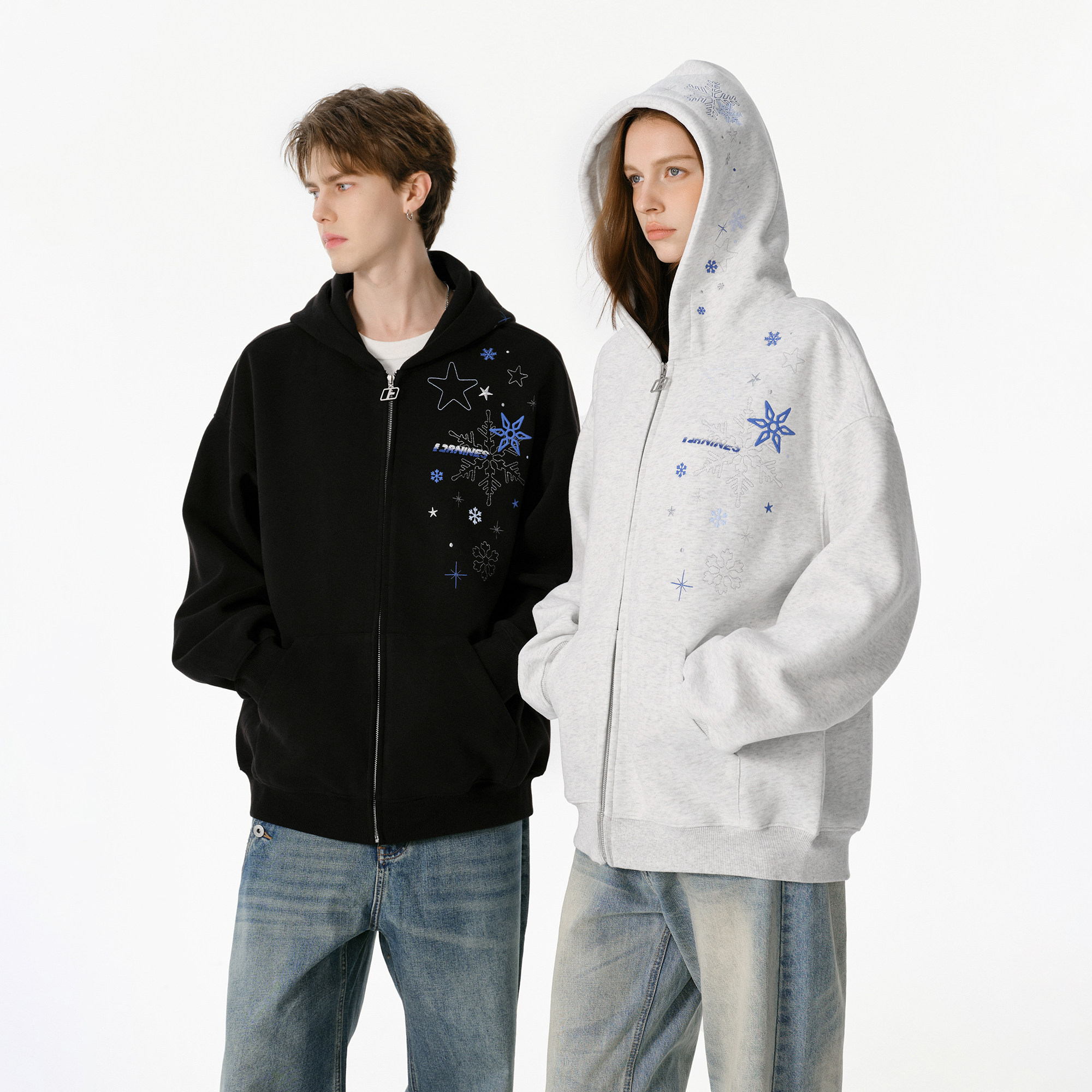 FORNINES国潮重磅雪花刺绣加绒卫衣男春秋情侣装连帽开衫加厚外套