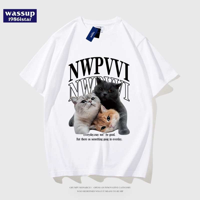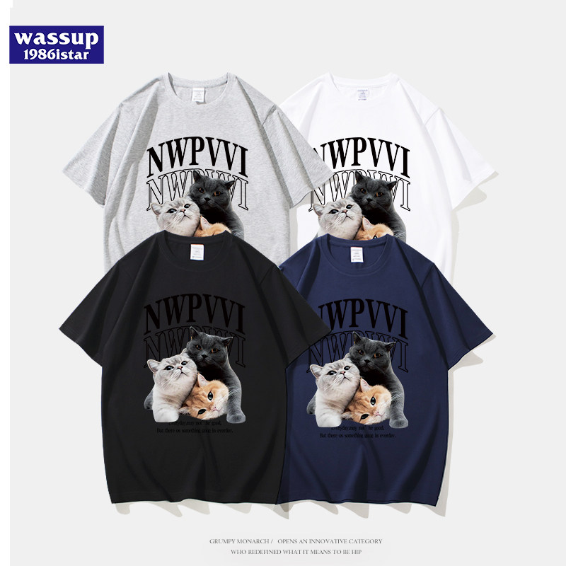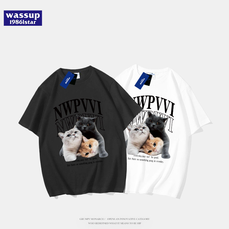 [三只小猫]新疆纯棉重磅短袖男t恤情侣夏季潮牌印花半袖圆领上衣