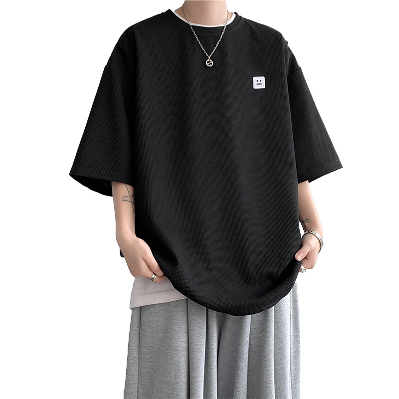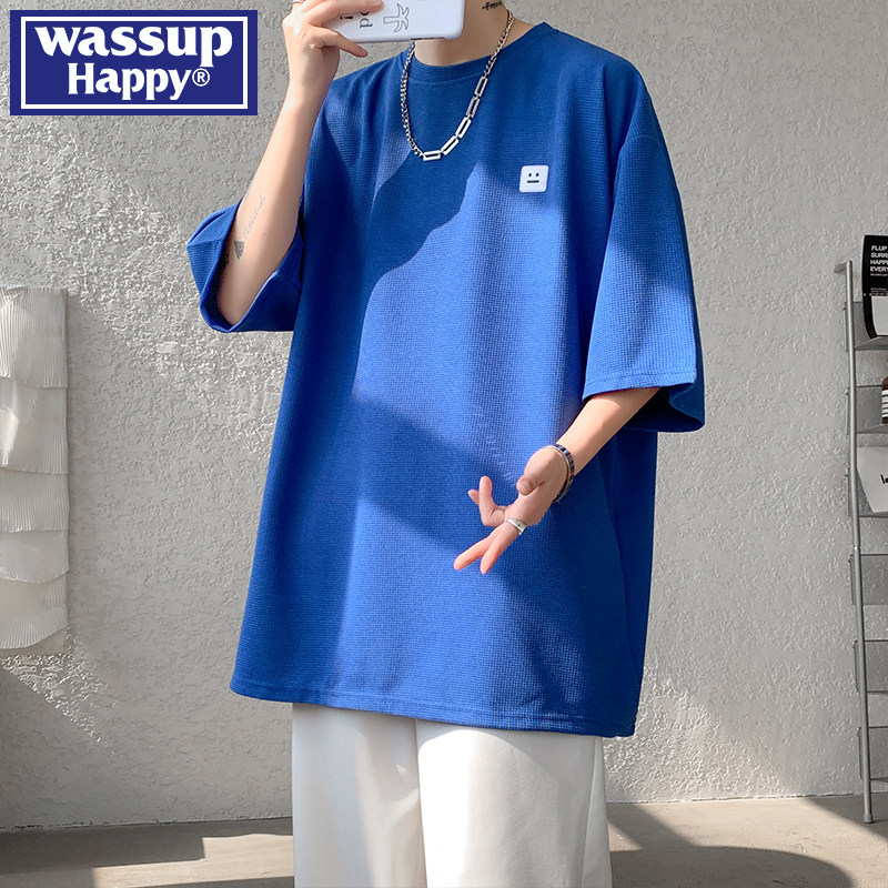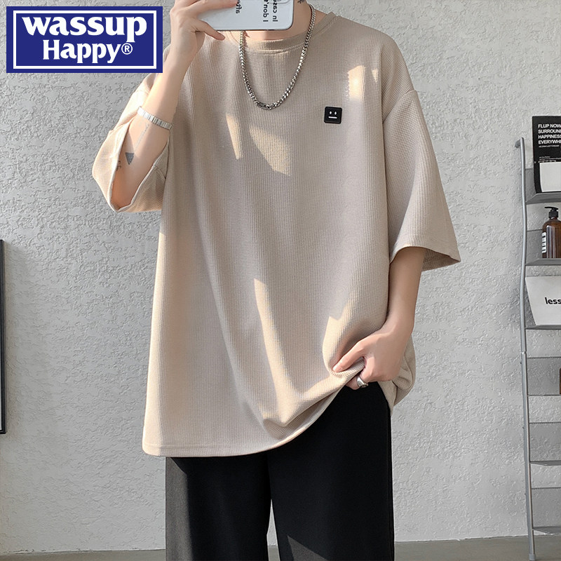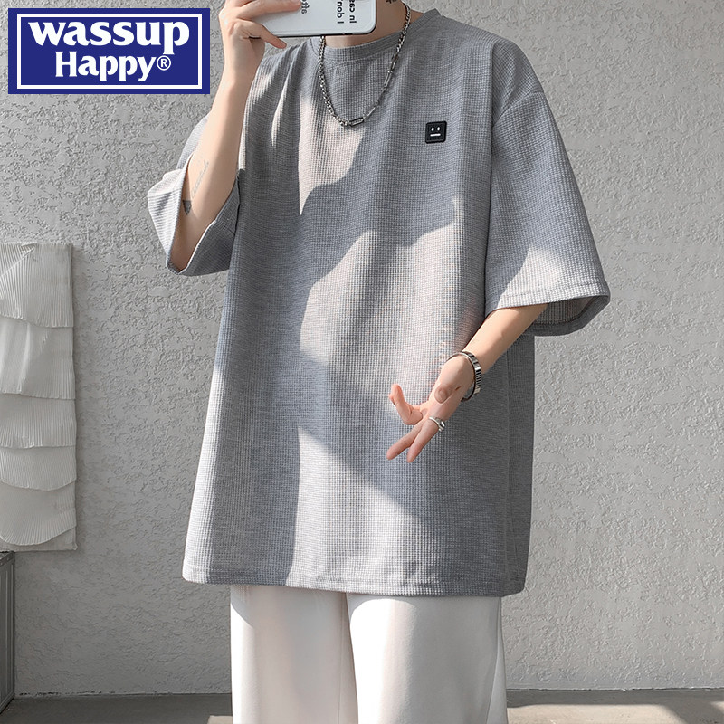 淘宝wassup happy华夫格短袖t恤男士夏季宽松大码半袖休闲圆领上衣服