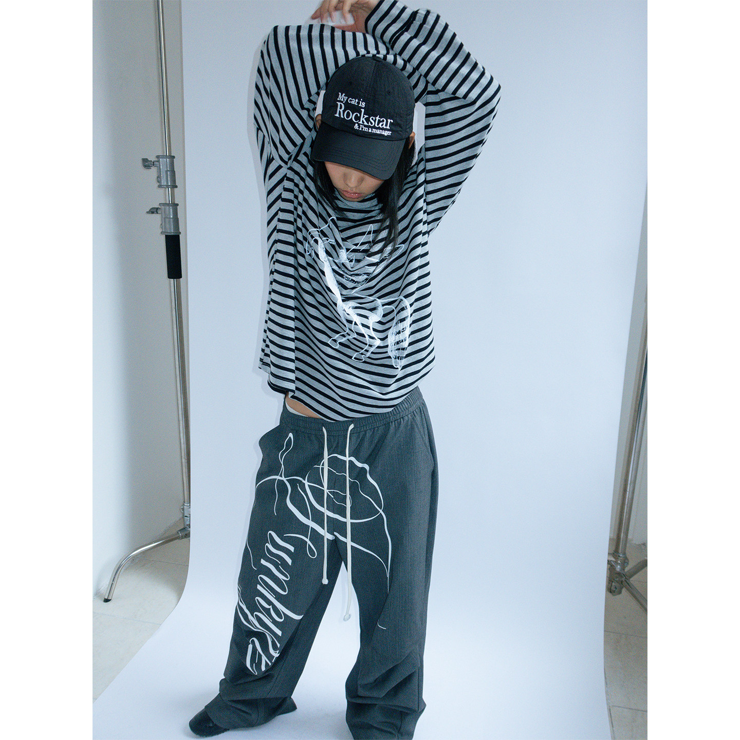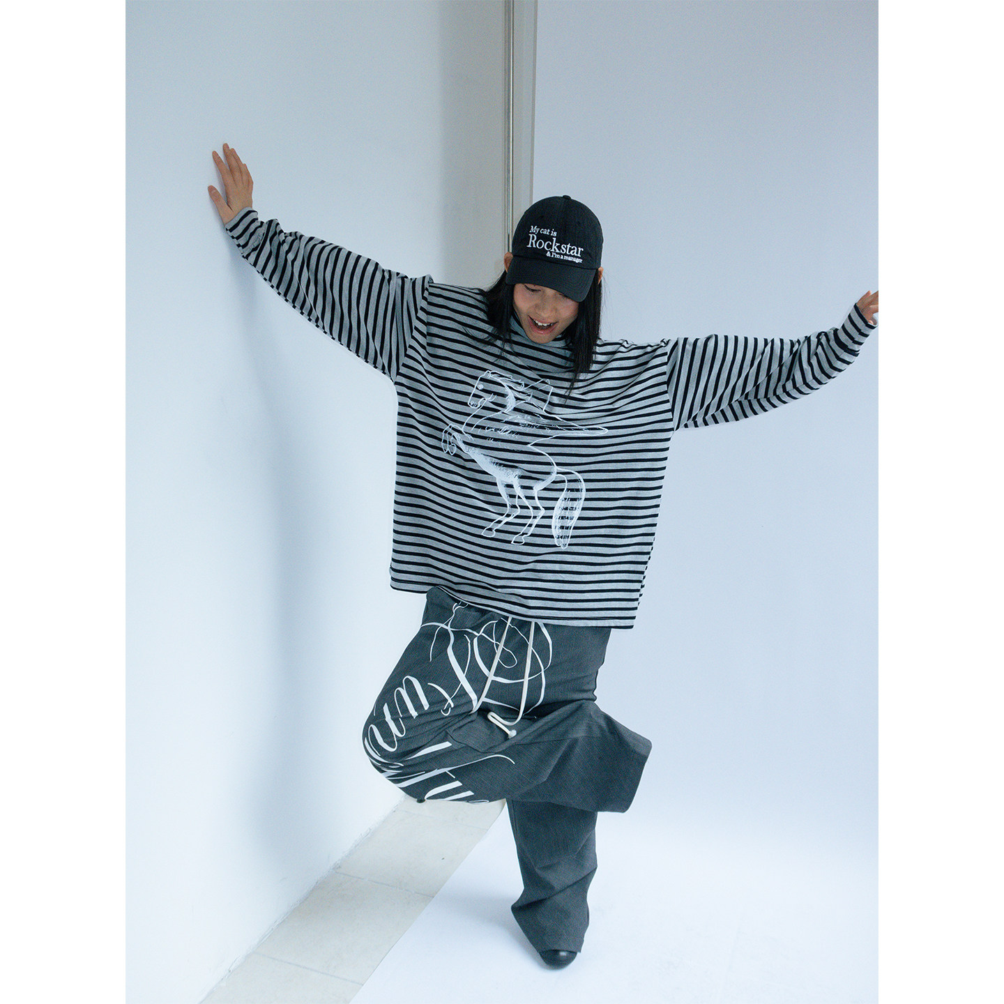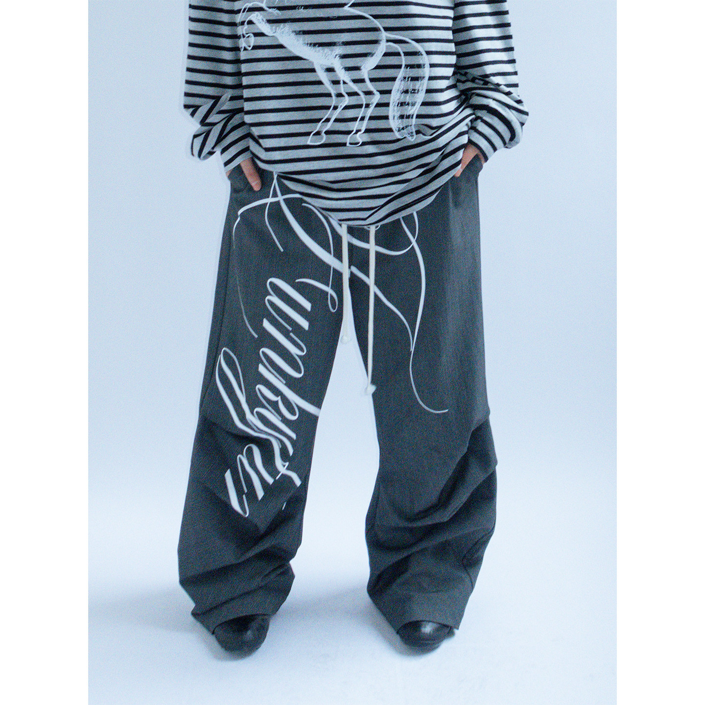 FUNKYFUN 原创手绘Logo涂鸦西装裤先锋设计悬垂阔腿裤暗条纹长裤