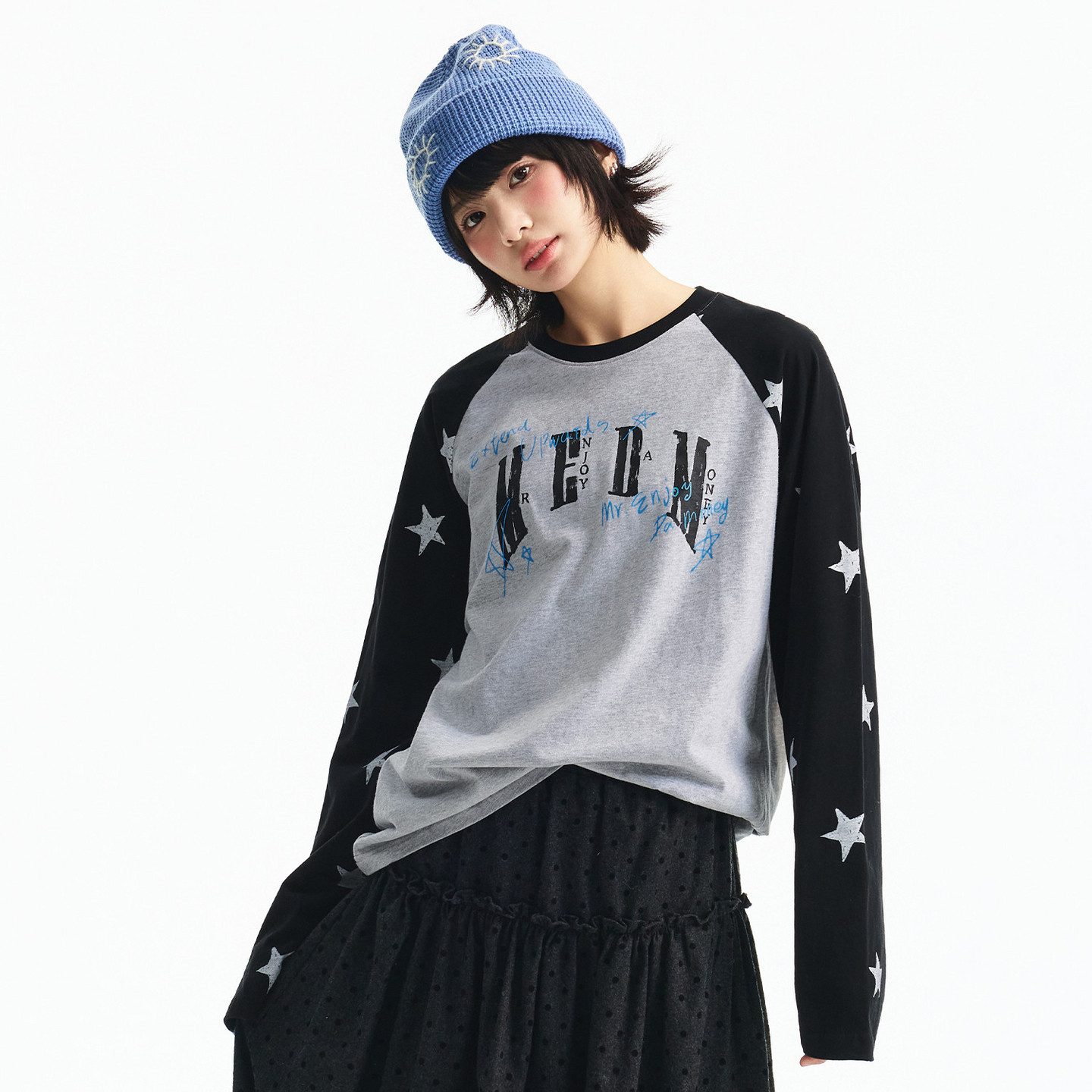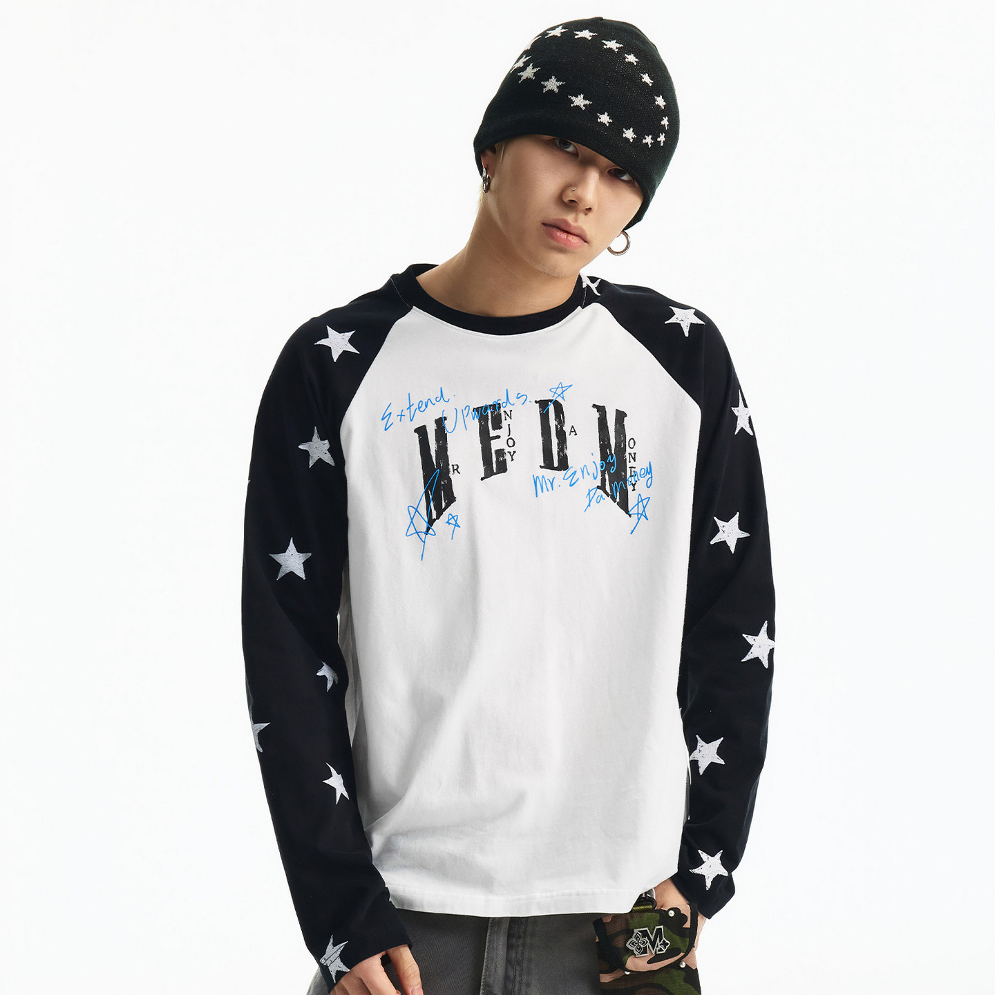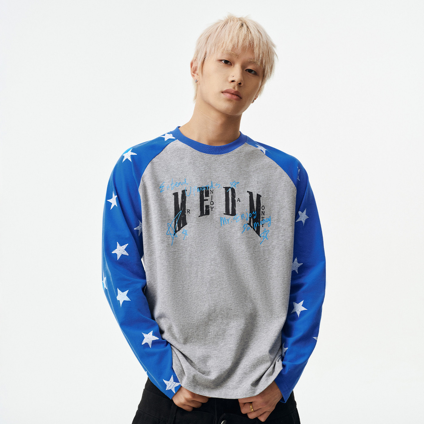 MEDM 手写涂鸦印花星星满印休闲插肩长袖T恤潮流男女同款宽松上衣