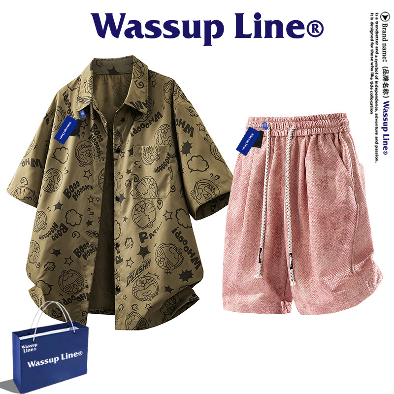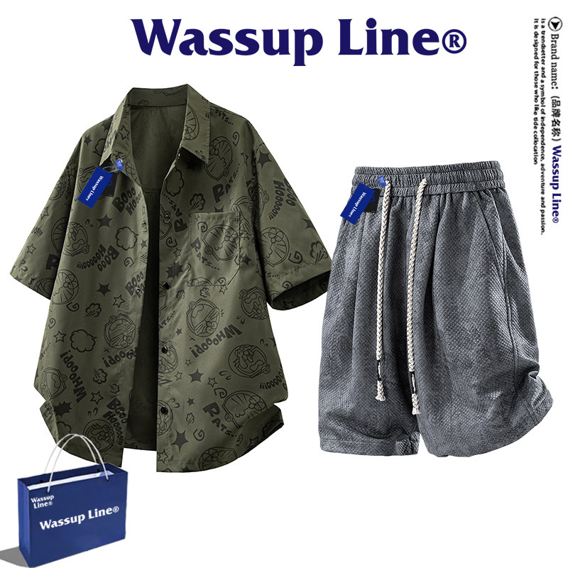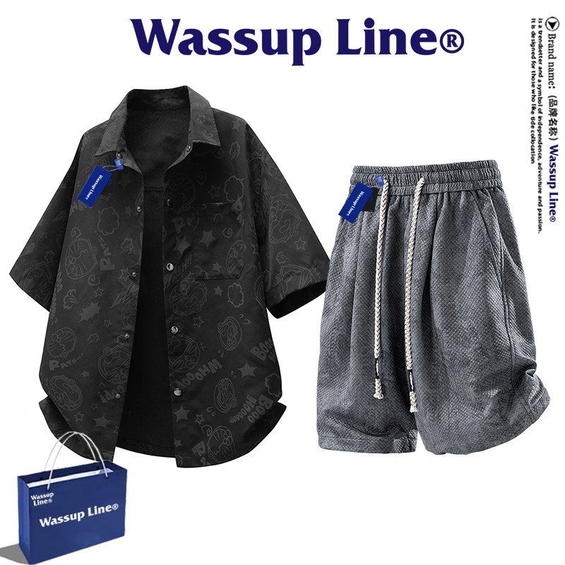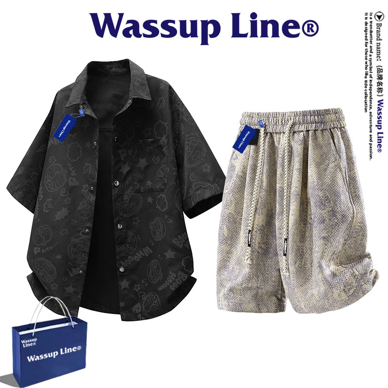 WASSUP Line潮牌套装男款夏季短袖衬衣宽松扎染短裤衬衫男两件套