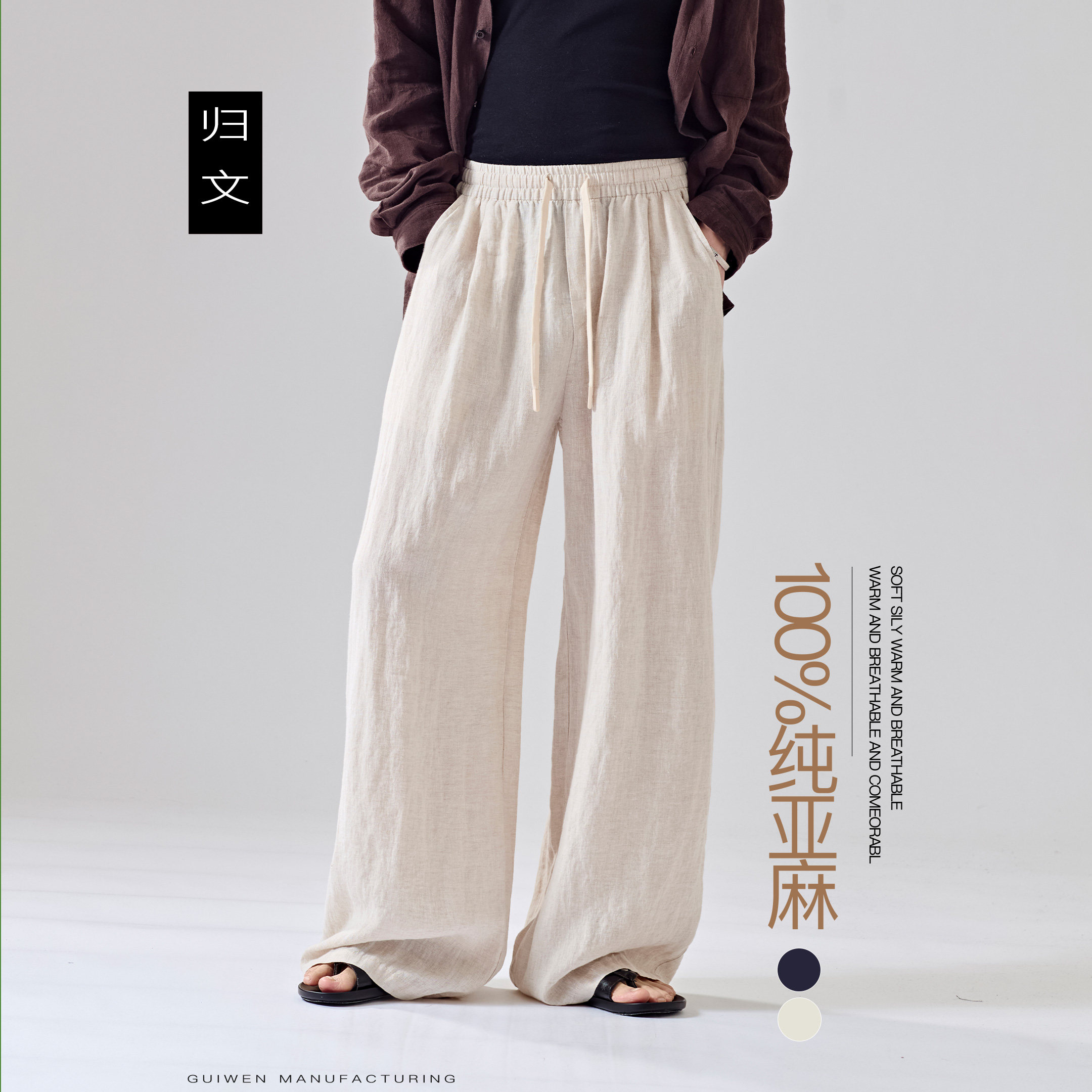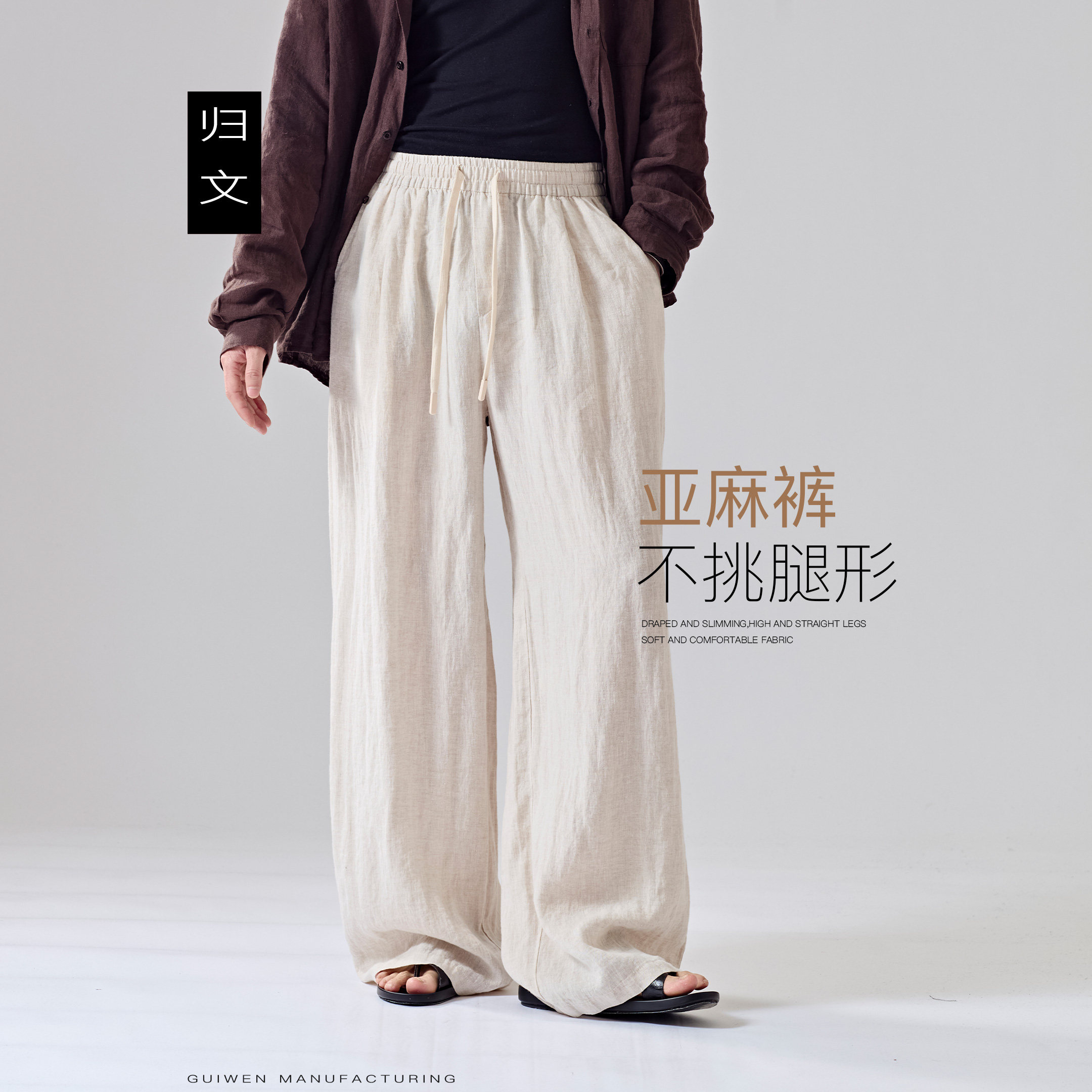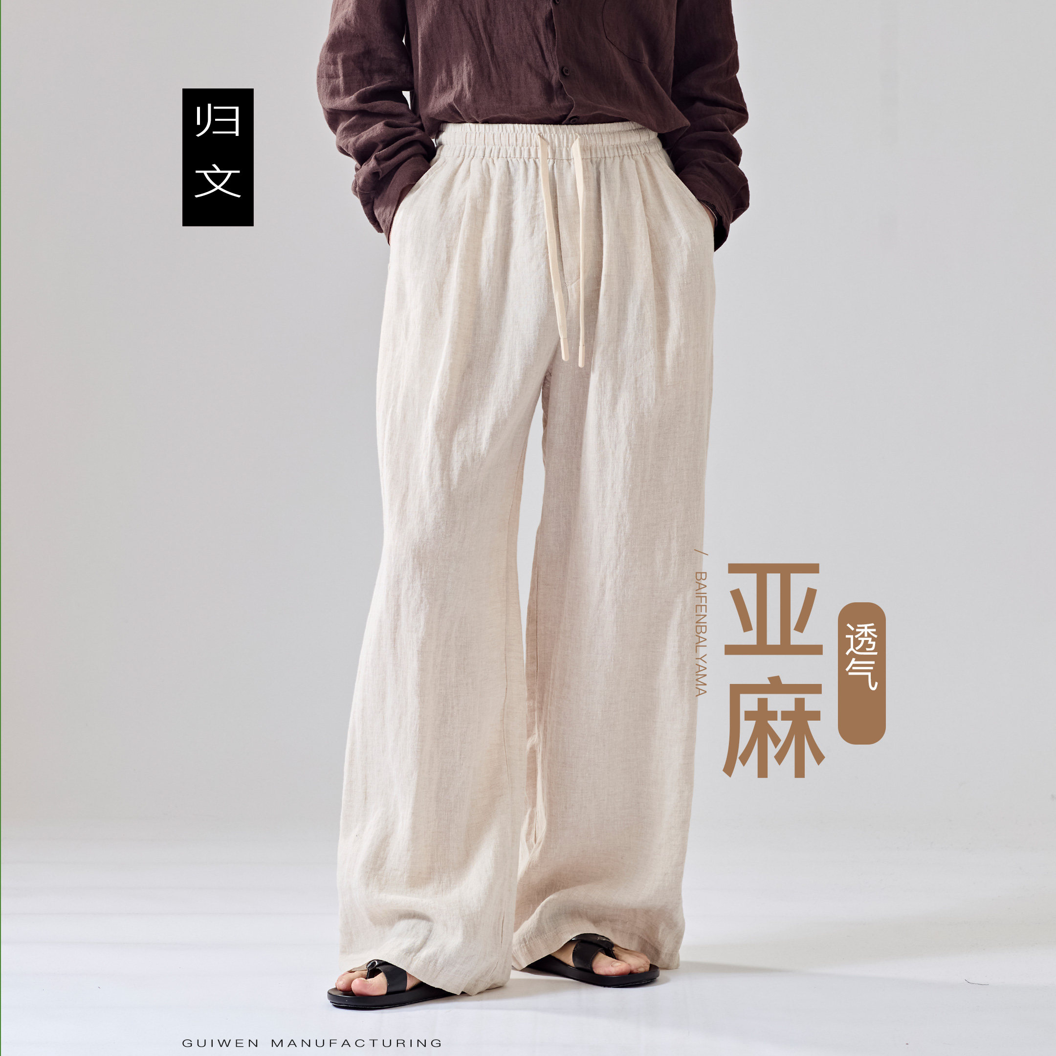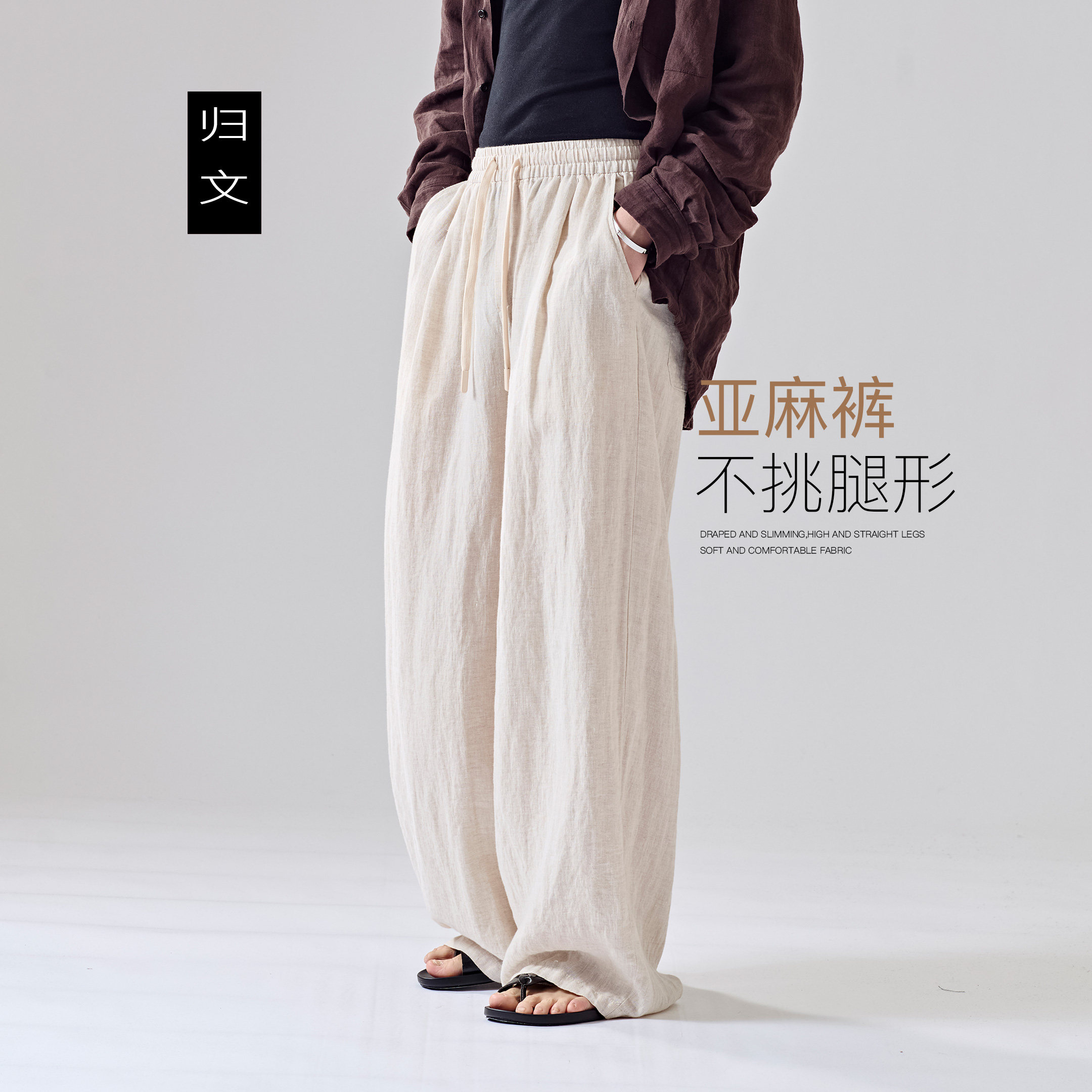 慵懒风纯亚麻阔腿裤男松紧腰抽绳宽松裤子男垂感长裤透气大码男裤