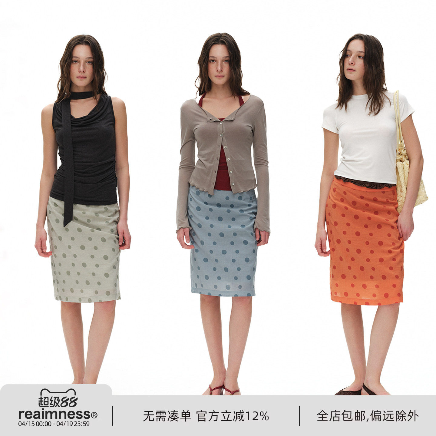 --------------------- ReAimNess* 清凉美波 波点半身裙双层设计度假风中长款半身裙女 【原售价】319元 【现售价】280元 【推荐理由】