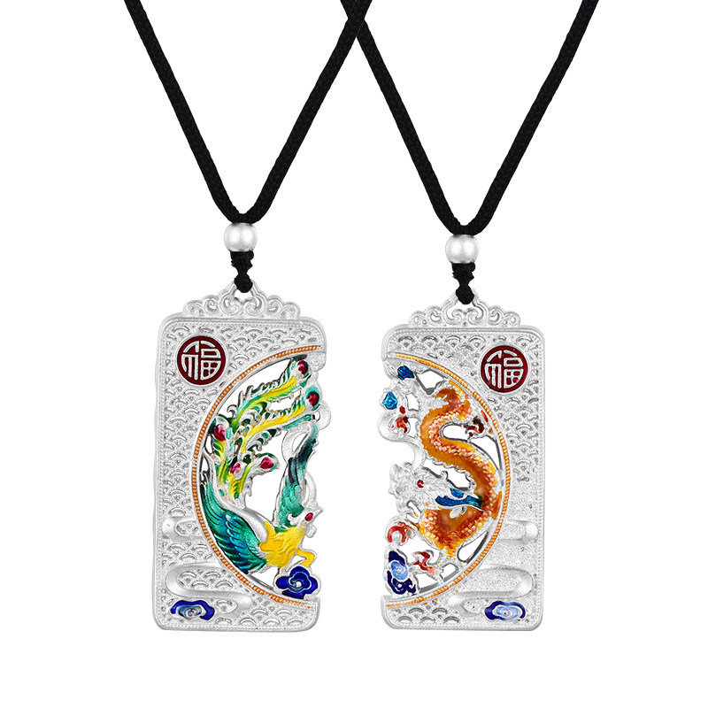 中国黄金龙凤牌吊坠珐琅龙凤999足银吊坠纯银情侣吊坠女神节