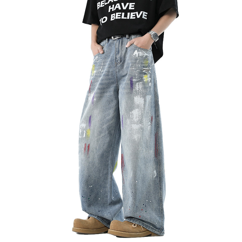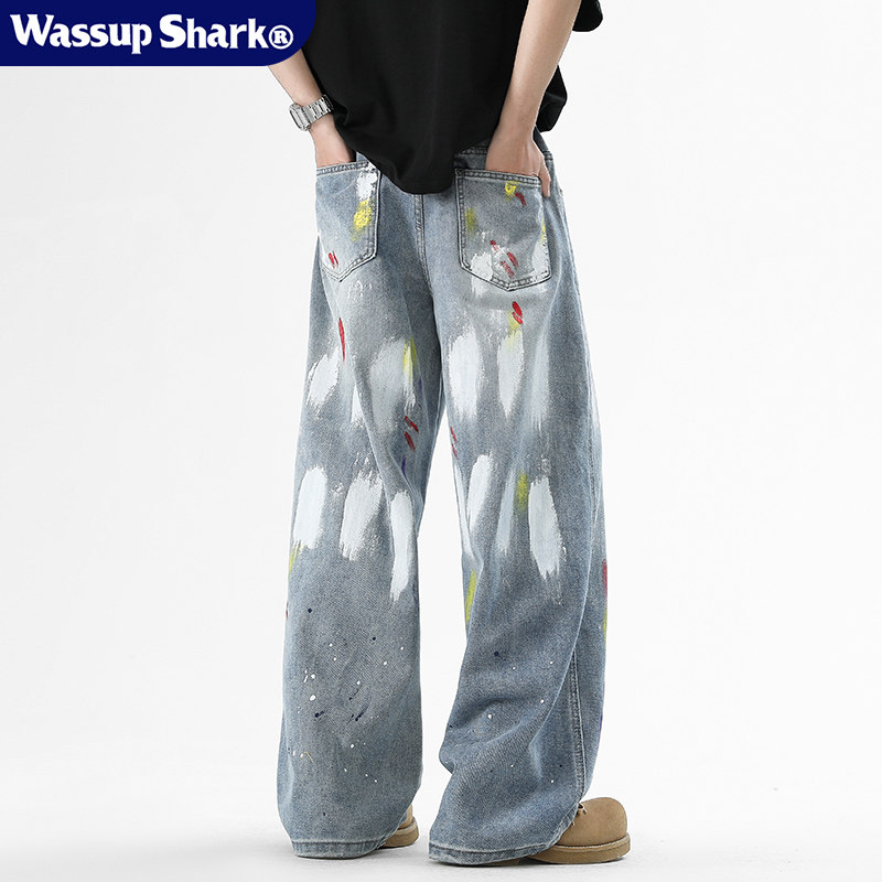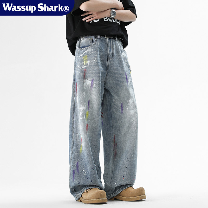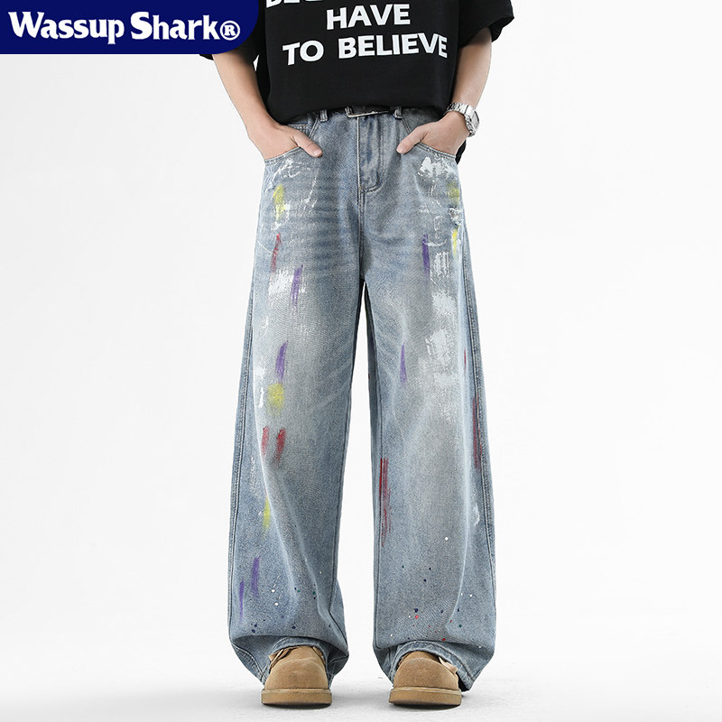 Wassup Shark美式复古小众涂鸦牛仔裤男女设计感油漆直筒休闲裤潮