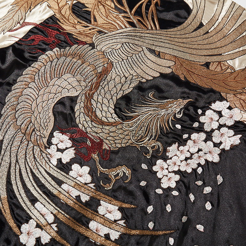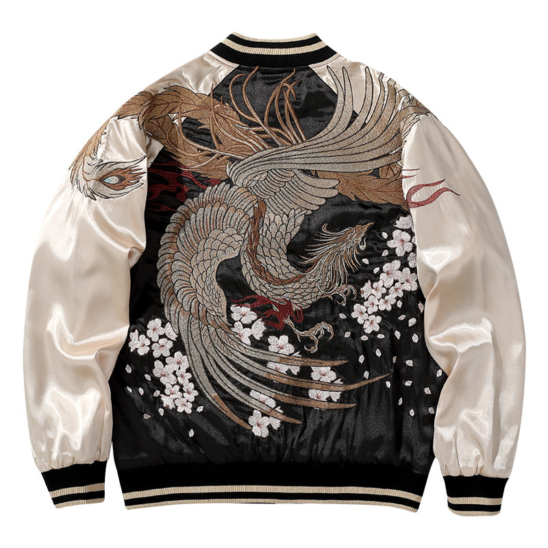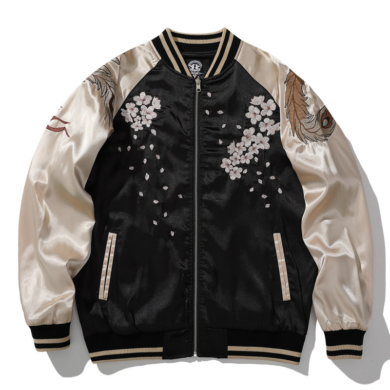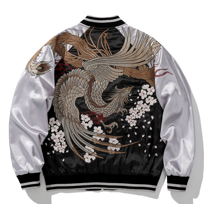 淘宝国潮春秋男士夹克外套横须贺重工刺绣棒球服朱雀上衣神兽缎面丝光