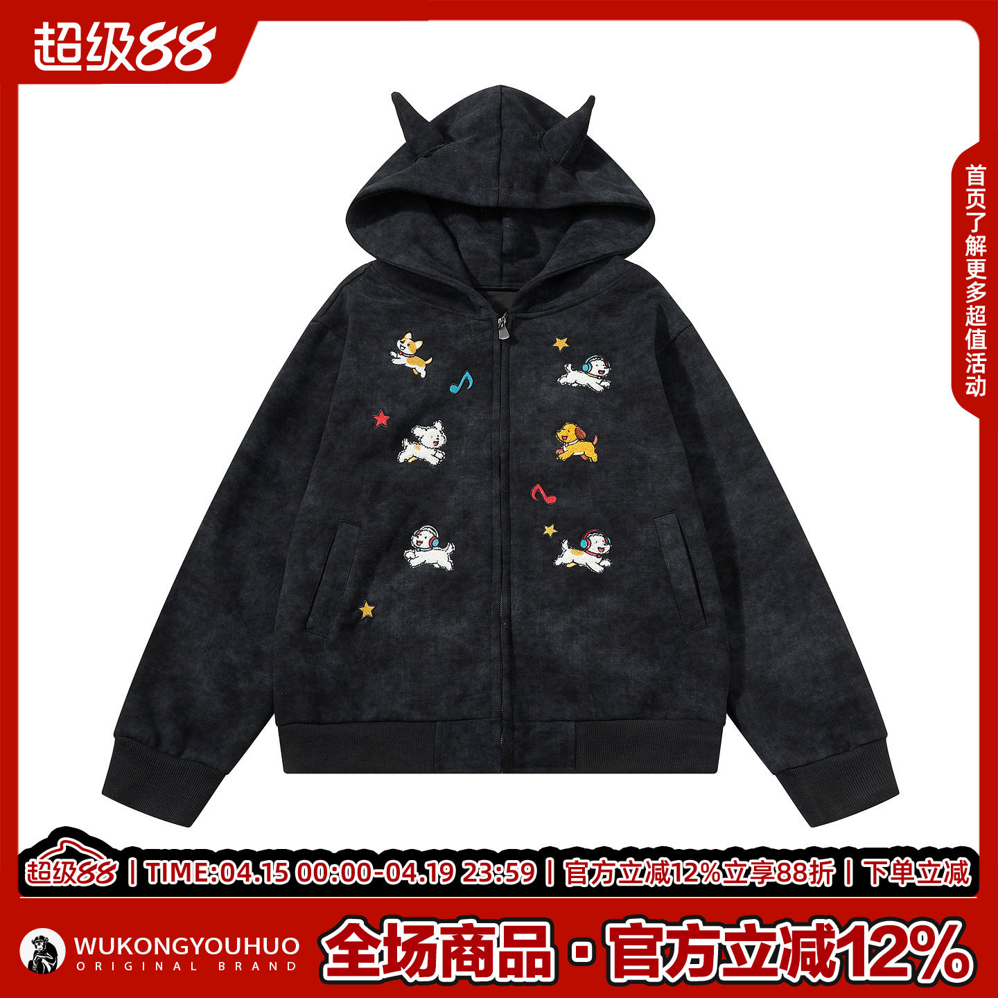 --------------------- 悟空有货美式小狗刺绣开衫连帽卫衣男女复古潮牌情侣百搭帽衫外套 【原售价】358元 【现售价】157元 【推荐理由】