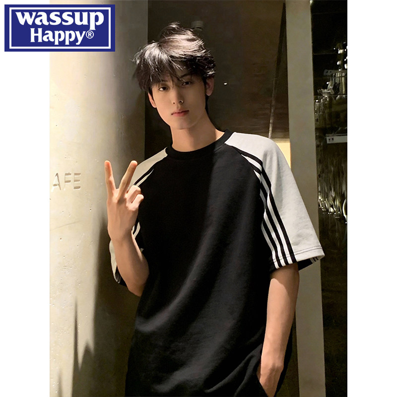 wassup happy撞色拼接条纹短袖t恤男士夏季新款美式宽松重磅半袖
