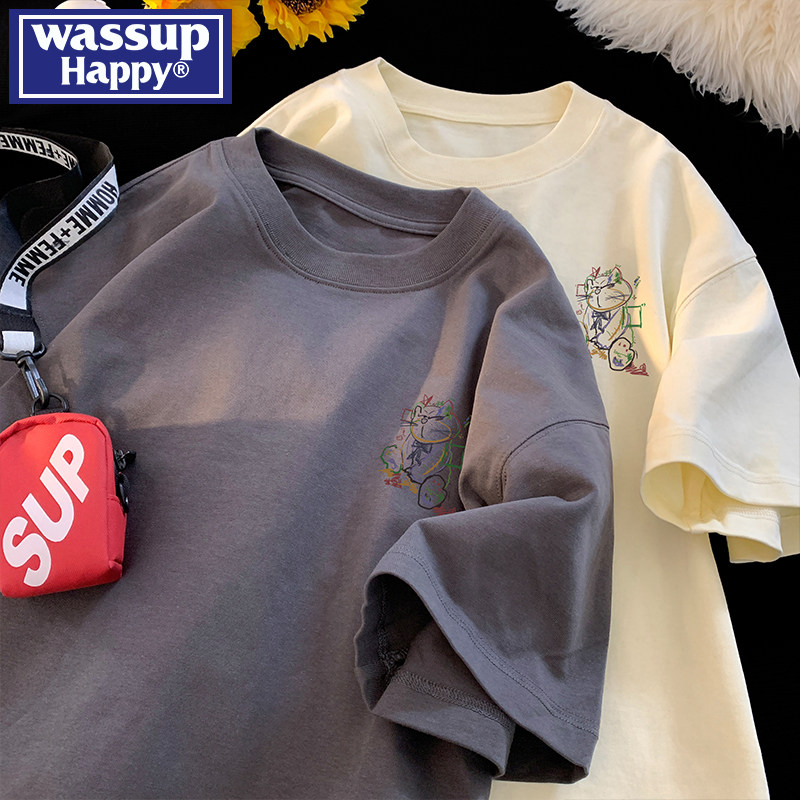 wassup happy卡通涂鸦纯棉短袖t恤男士夏季薄款宽松圆领半袖体恤