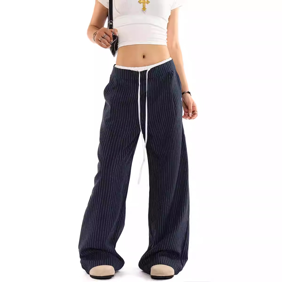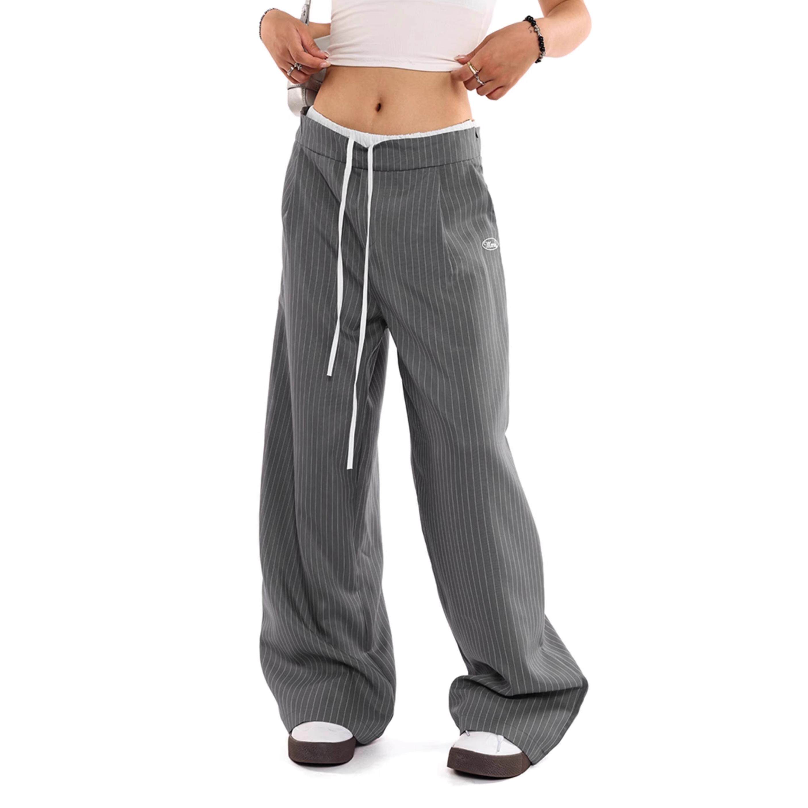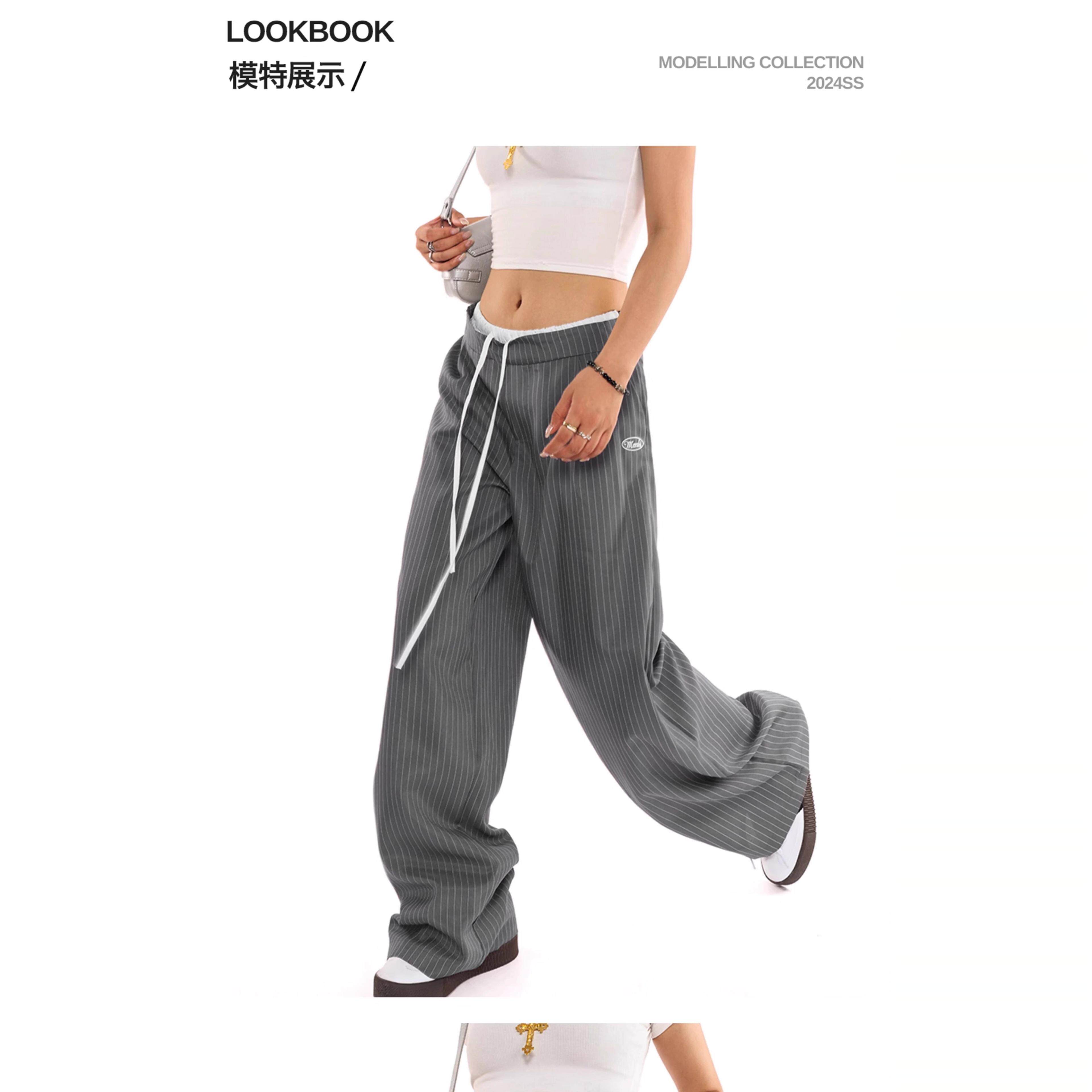 0123Start 拼接双腰头假两件条纹西装裤男女宽松美式复古休闲裤潮