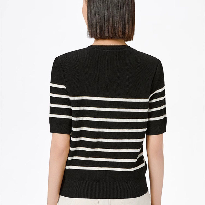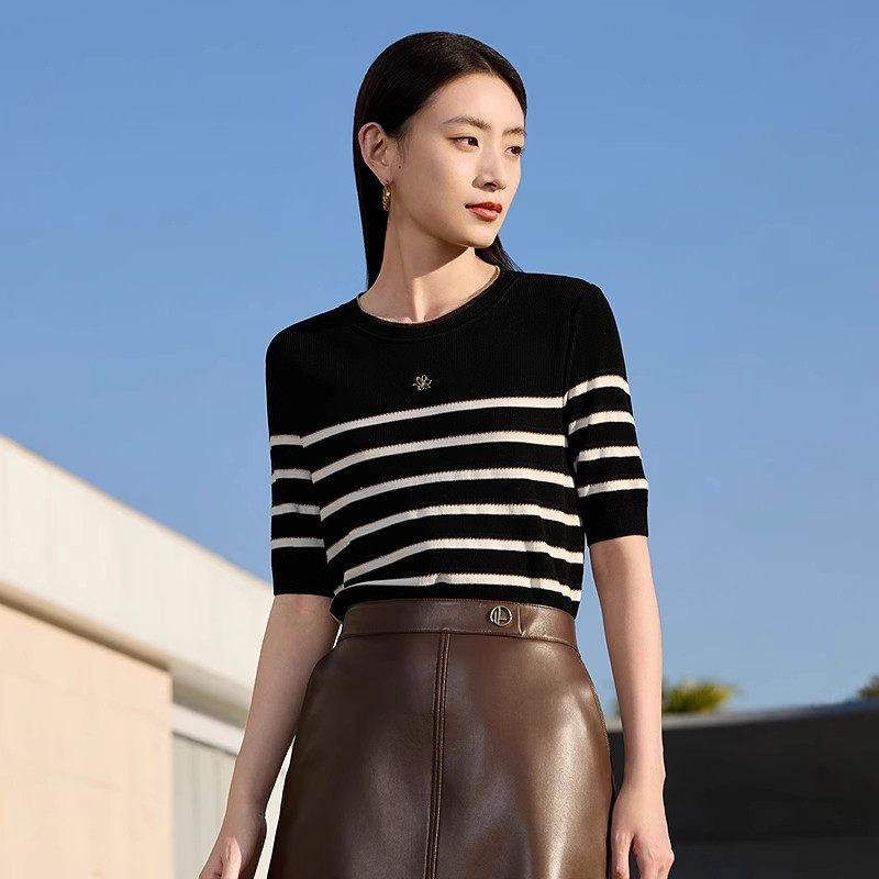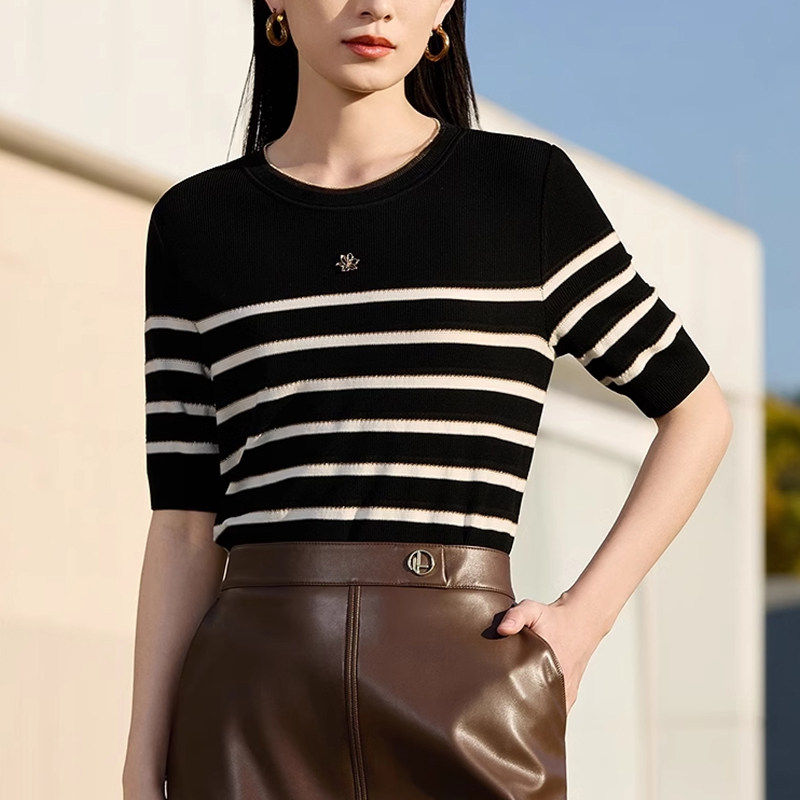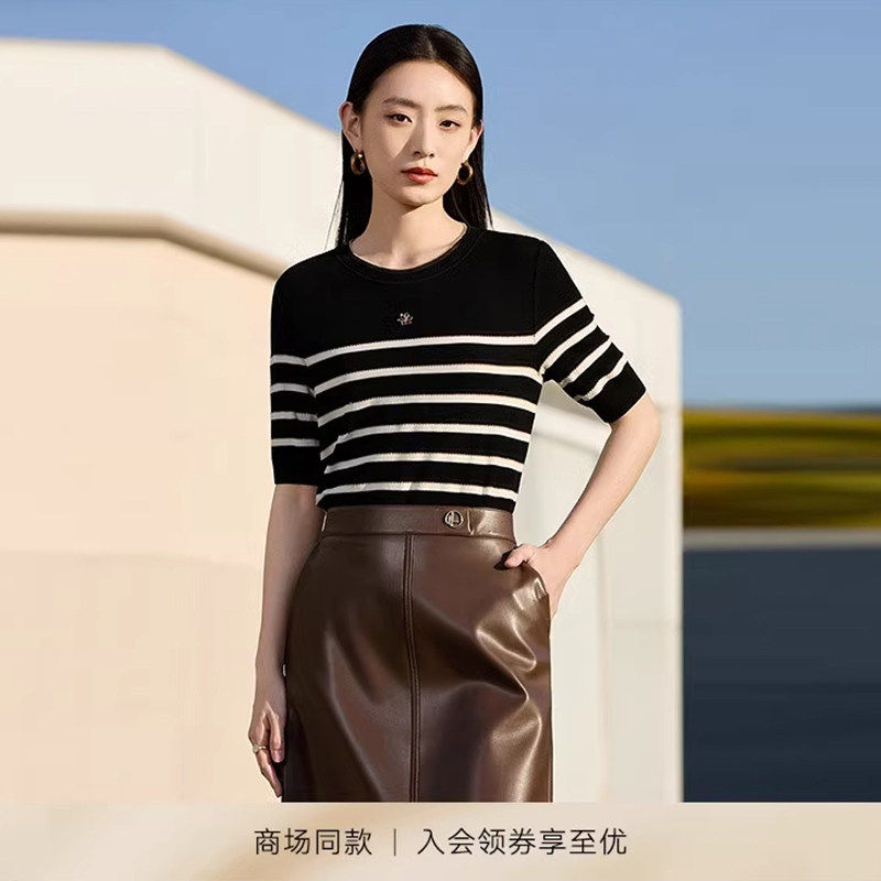 娜家商场同款简约百搭条纹针织衫短袖2026年夏季新款舒适上衣女装