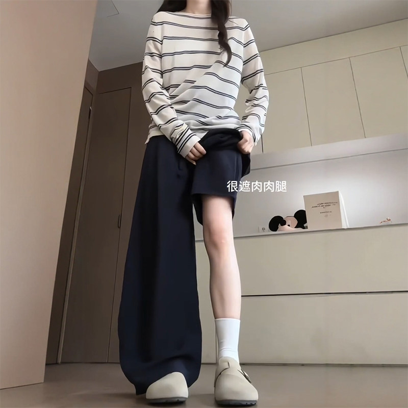 胖mm大码藏青色亚麻香蕉裤春季女装阔腿弯刀裤慵懒风运动镰刀裤子
