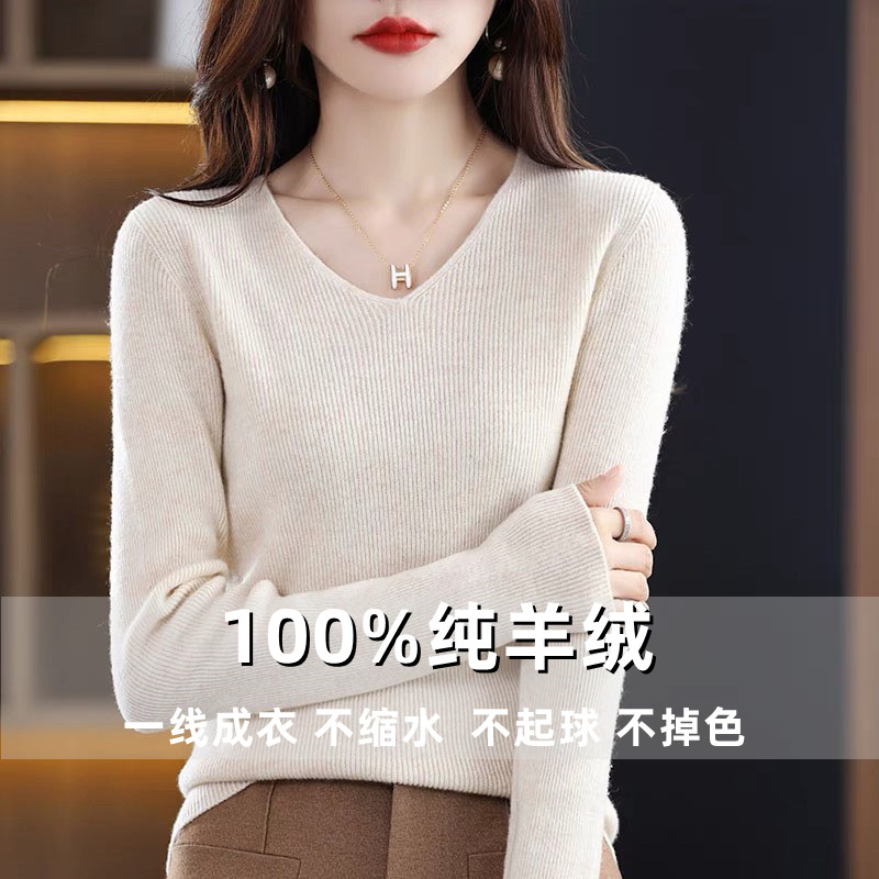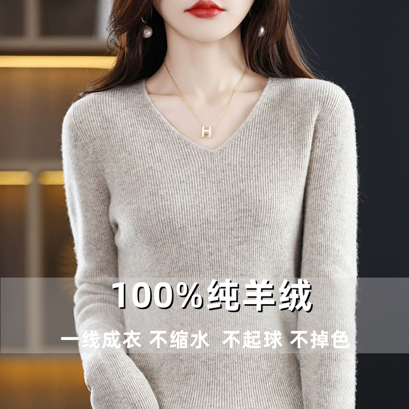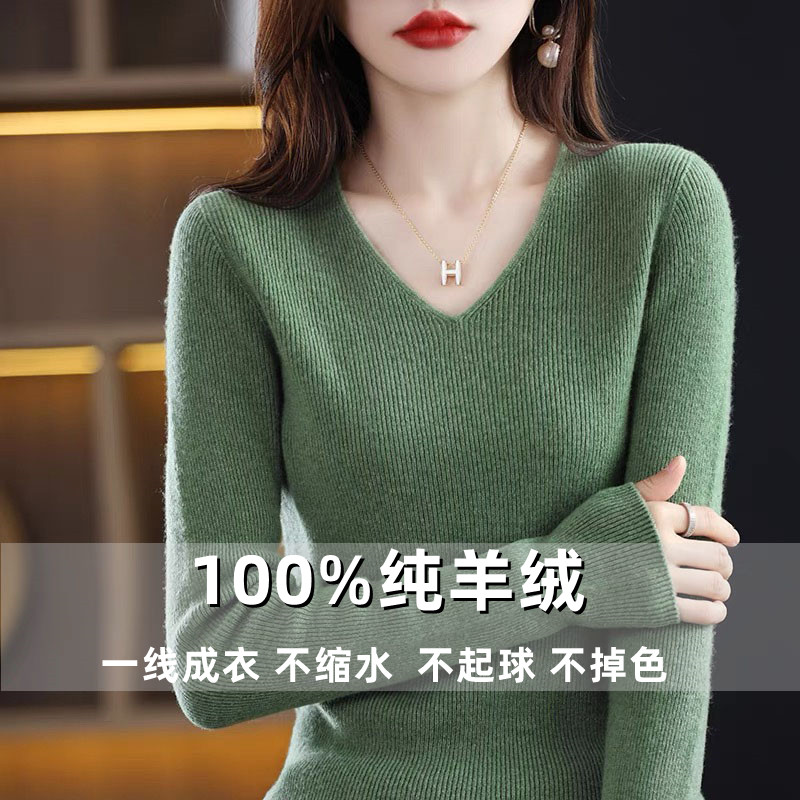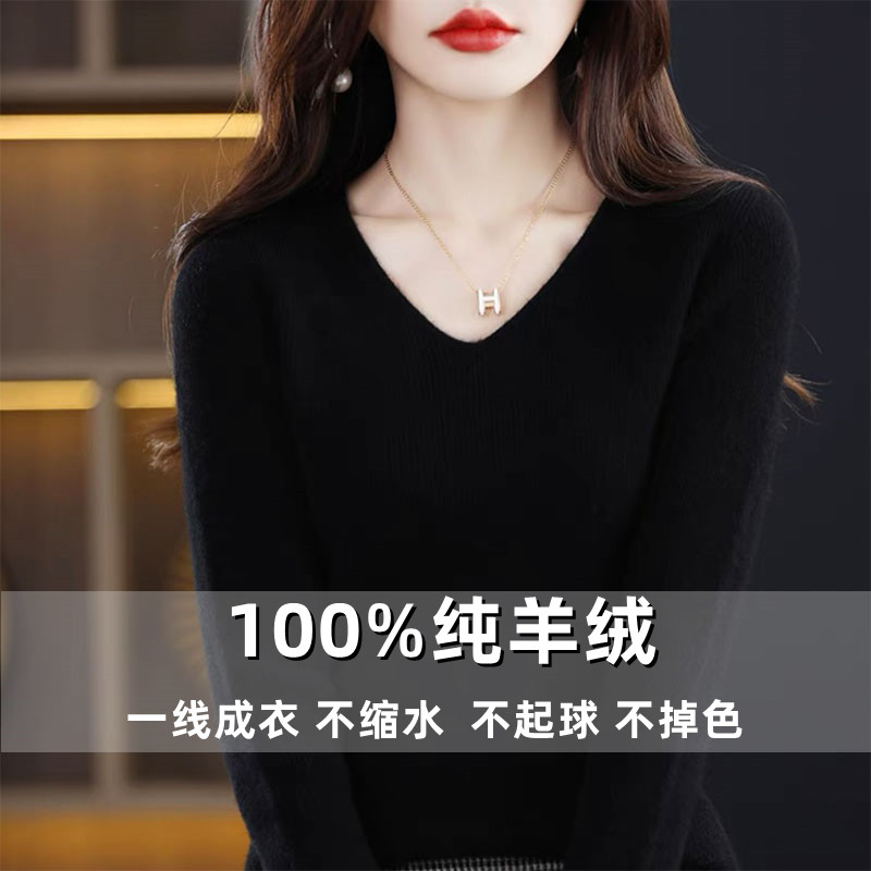鄂尔多斯市羊绒衫女V领一线成衣羊毛套头内搭毛衣修身针织打底衫