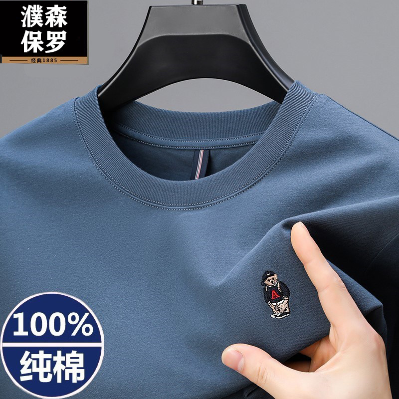 濮森保罗100%全棉重磅短袖t恤男士高端品牌刺绣圆领纯棉夏装体恤