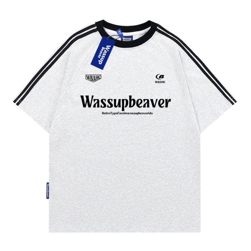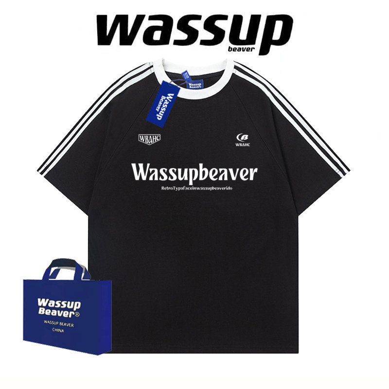 WASSUP BEAVER美式潮牌三条杠宽松复古短袖T恤男女情侣圆领上衣夏