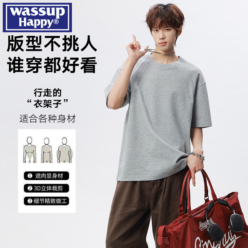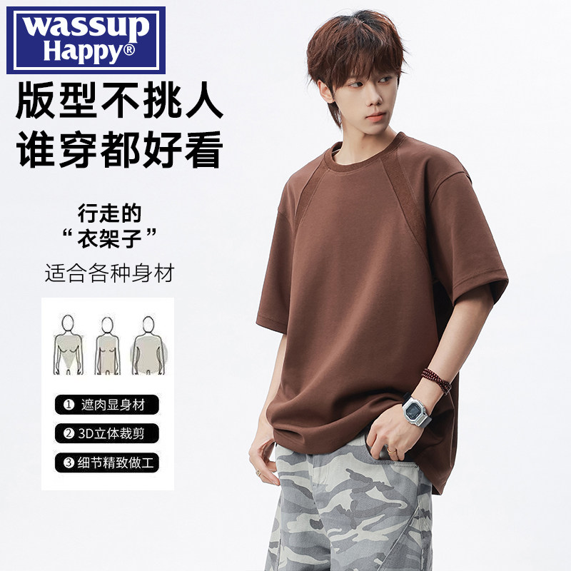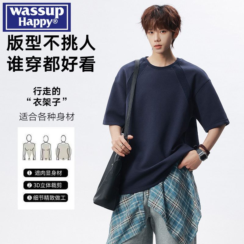 wassup happy美式解构纯色短袖t恤男士夏季重磅宽松休闲圆领上衣