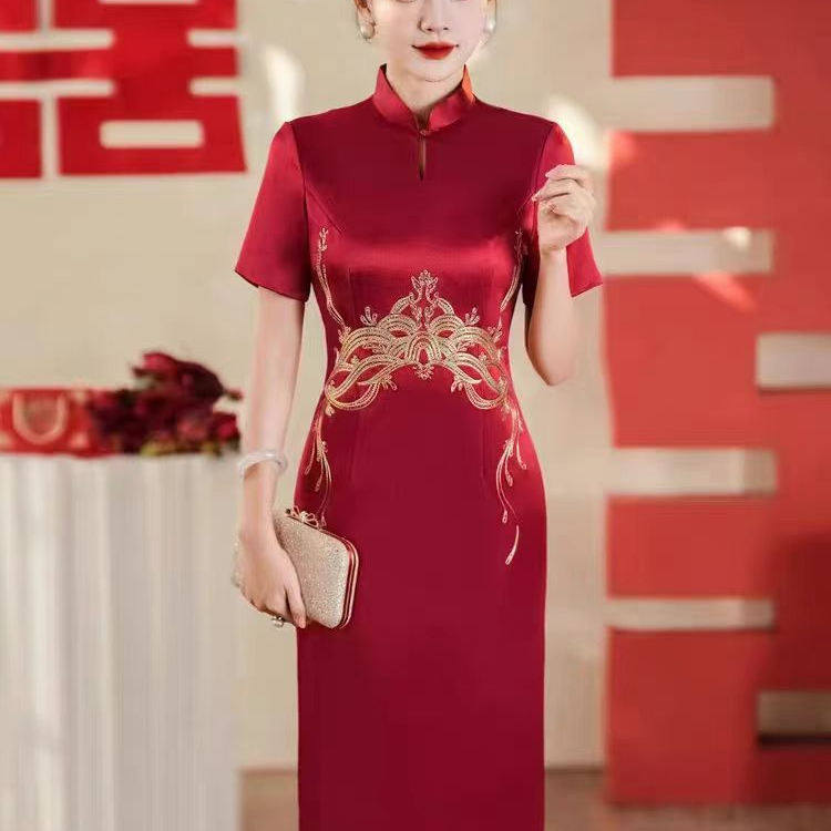新款刺绣时尚高端喜婆婆婚宴红色醋酸旗袍礼服复古改良婚礼礼服