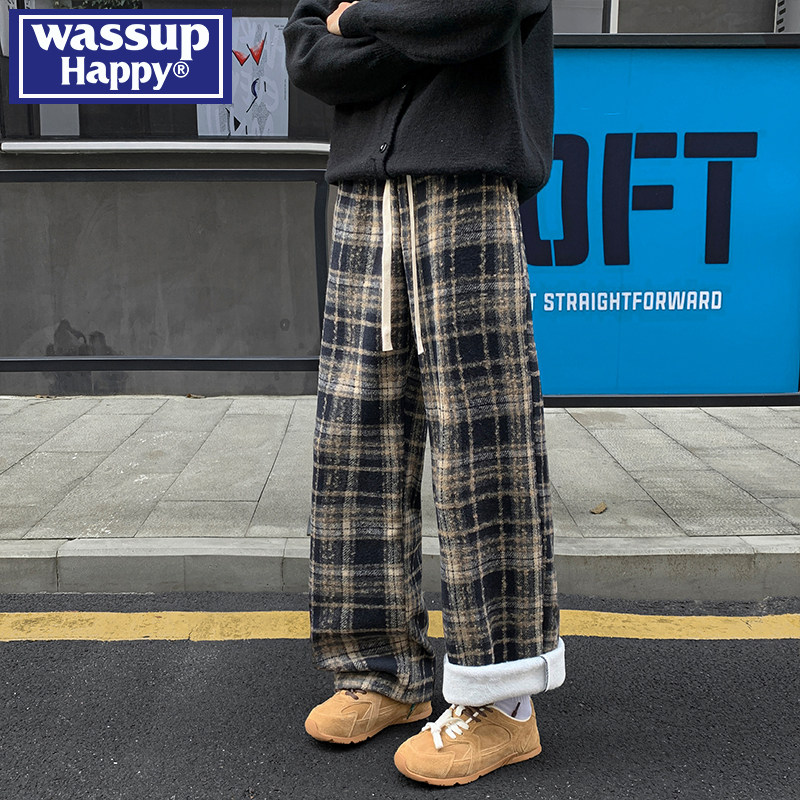 wassup happy格子毛呢休闲裤子男冬季潮牌加绒厚宽松直筒阔腿长裤