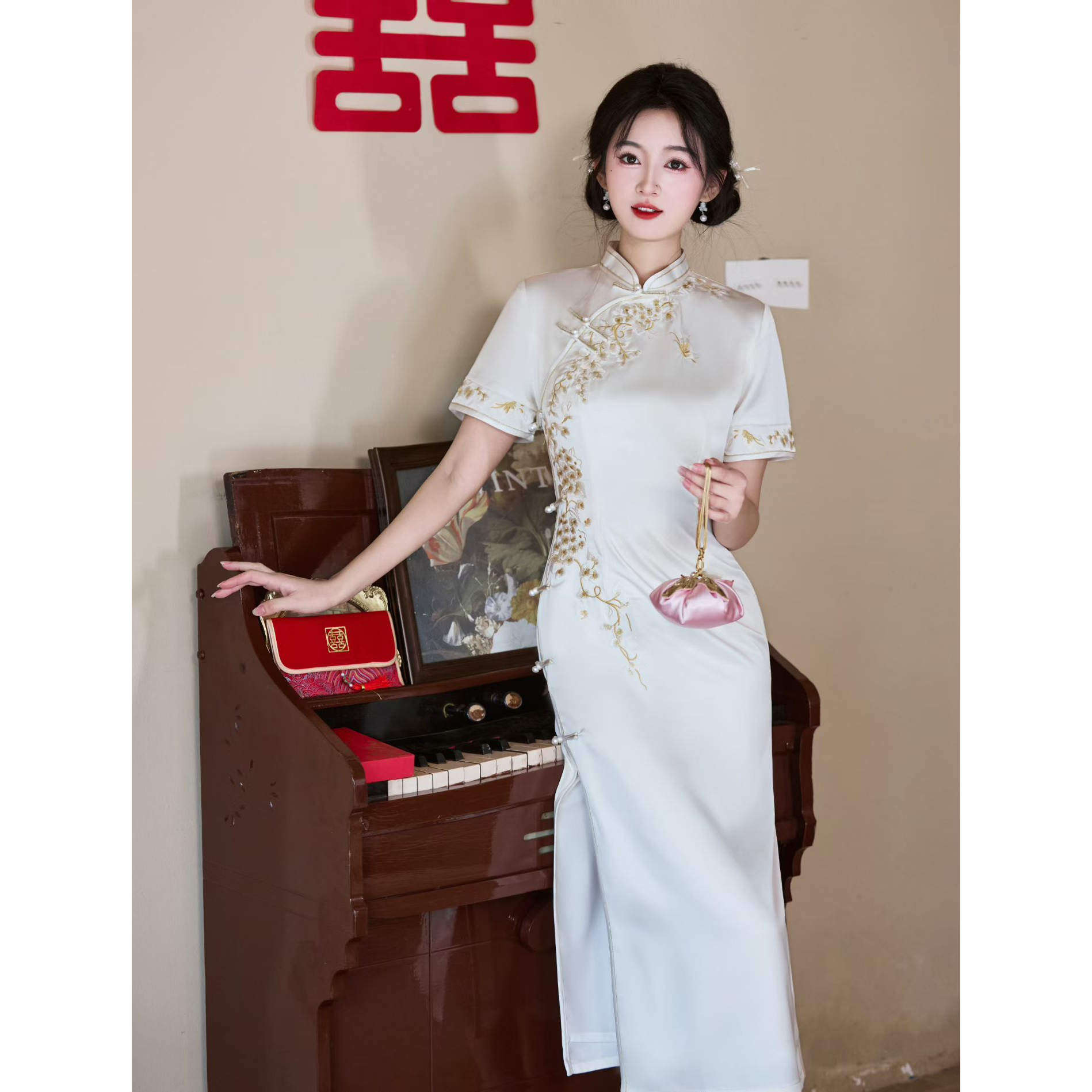 新中式改良旗袍女白色刺绣短袖长裙复古风气质连衣裙
