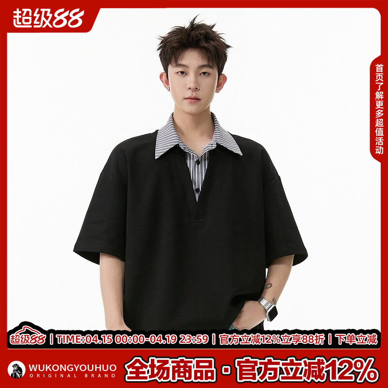 悟空有货美式复古假两件条纹翻领T恤男学院风宽松百搭短袖POLO衫