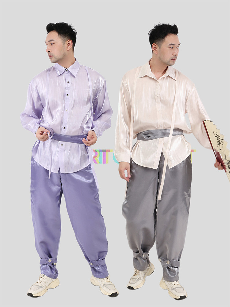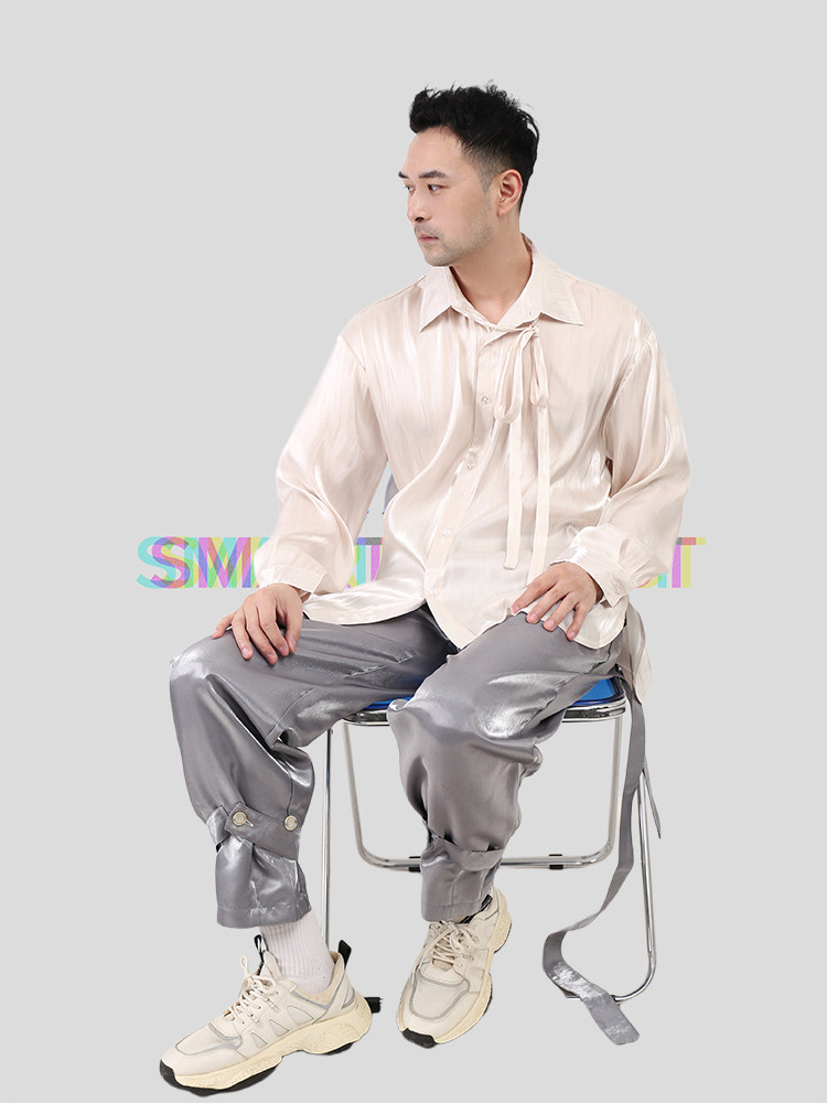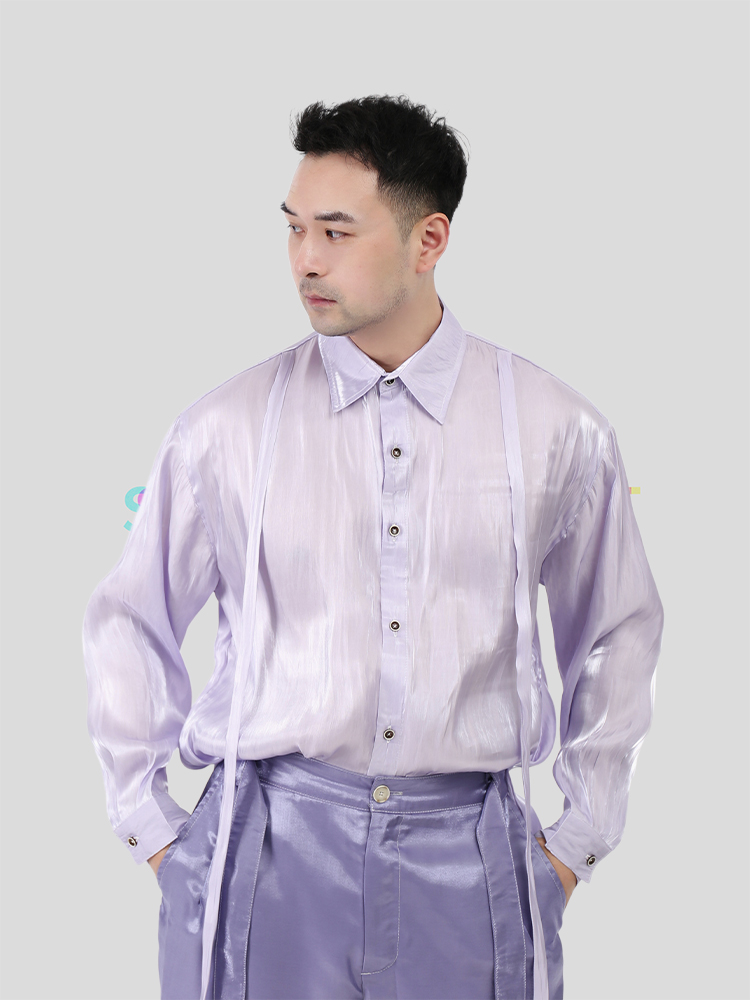 smelt炼设计师液态金属绸缎质感紫色飘带衬衣飘逸男上衣