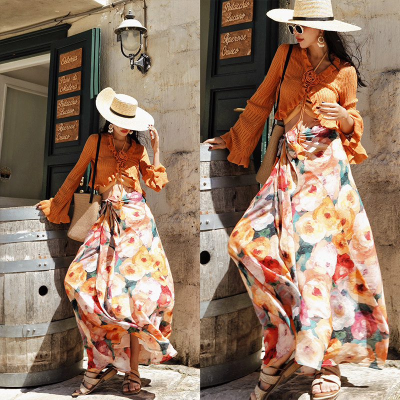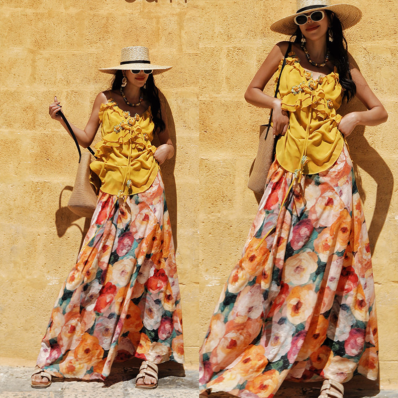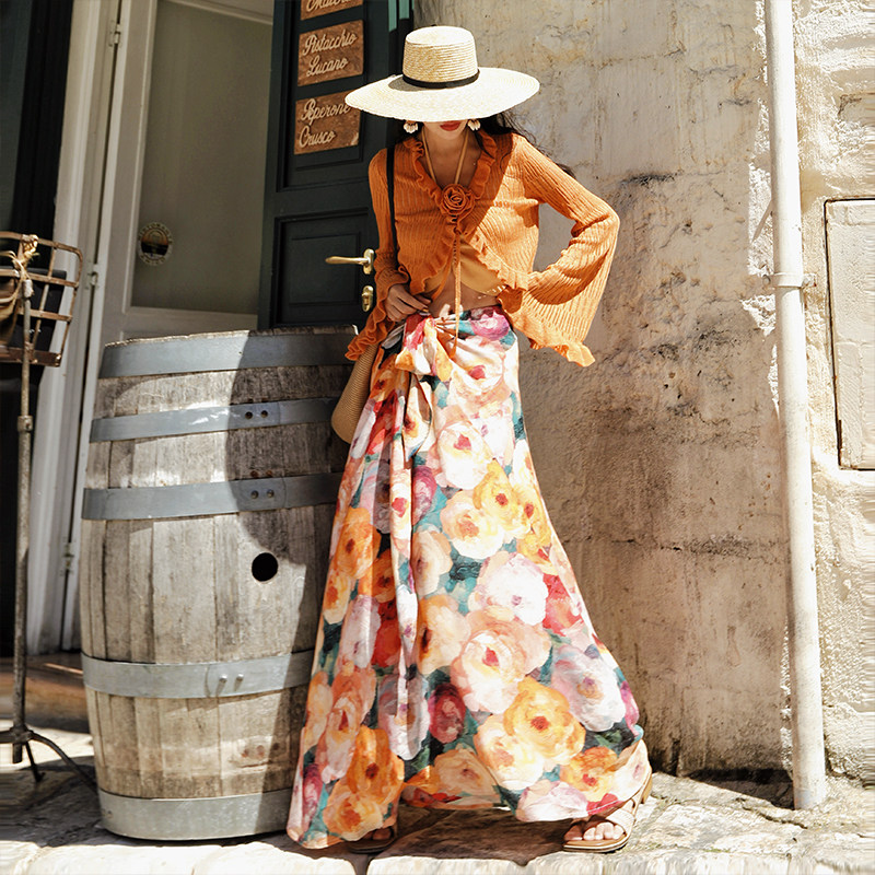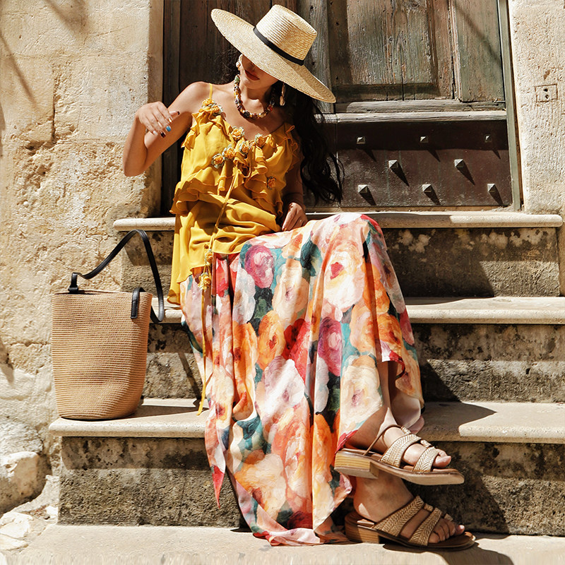 麦叙原创《漫游花镜》法式度假风油画印花两穿半身裙/挂脖连衣裙