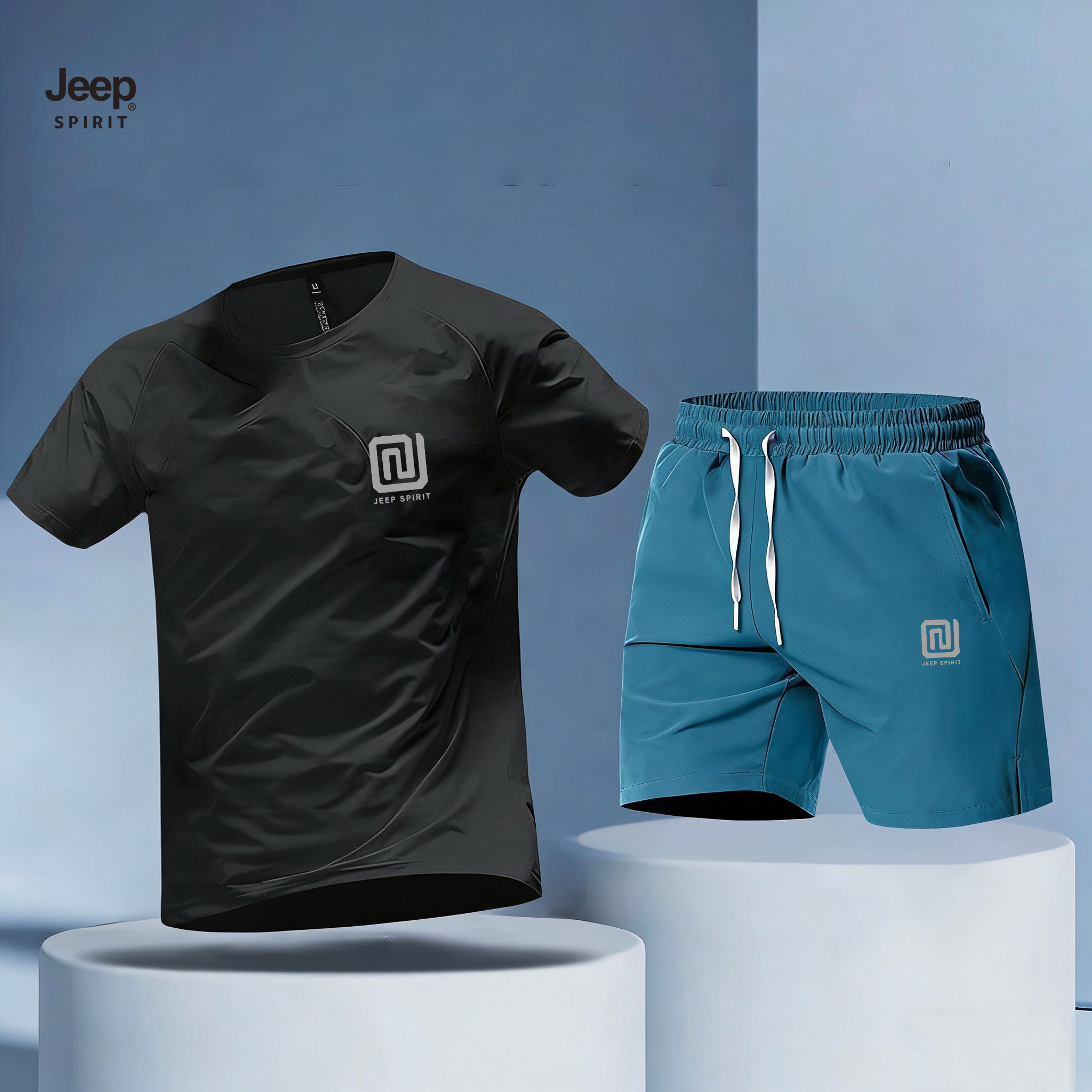 JEEP吉普男士运动套装夏薄款冰丝短裤男款跑步健身速干短袖t恤男