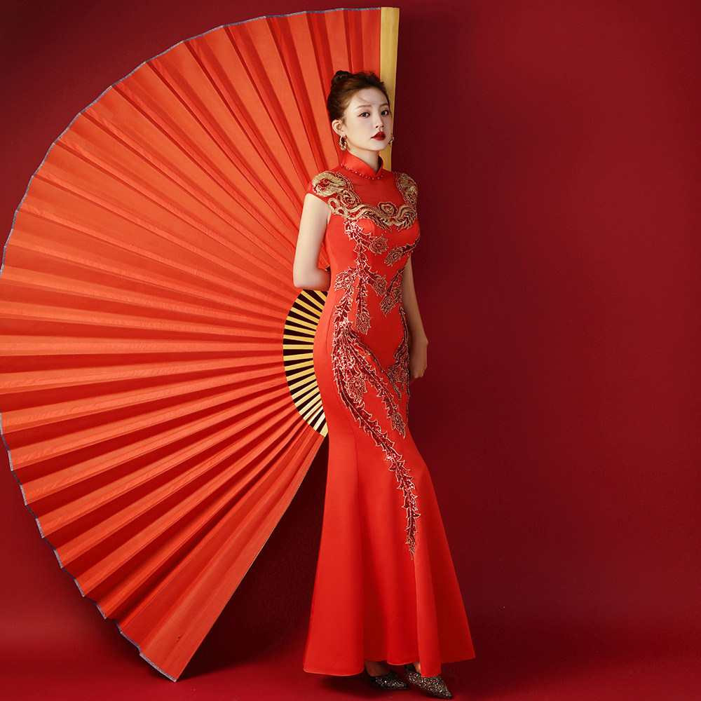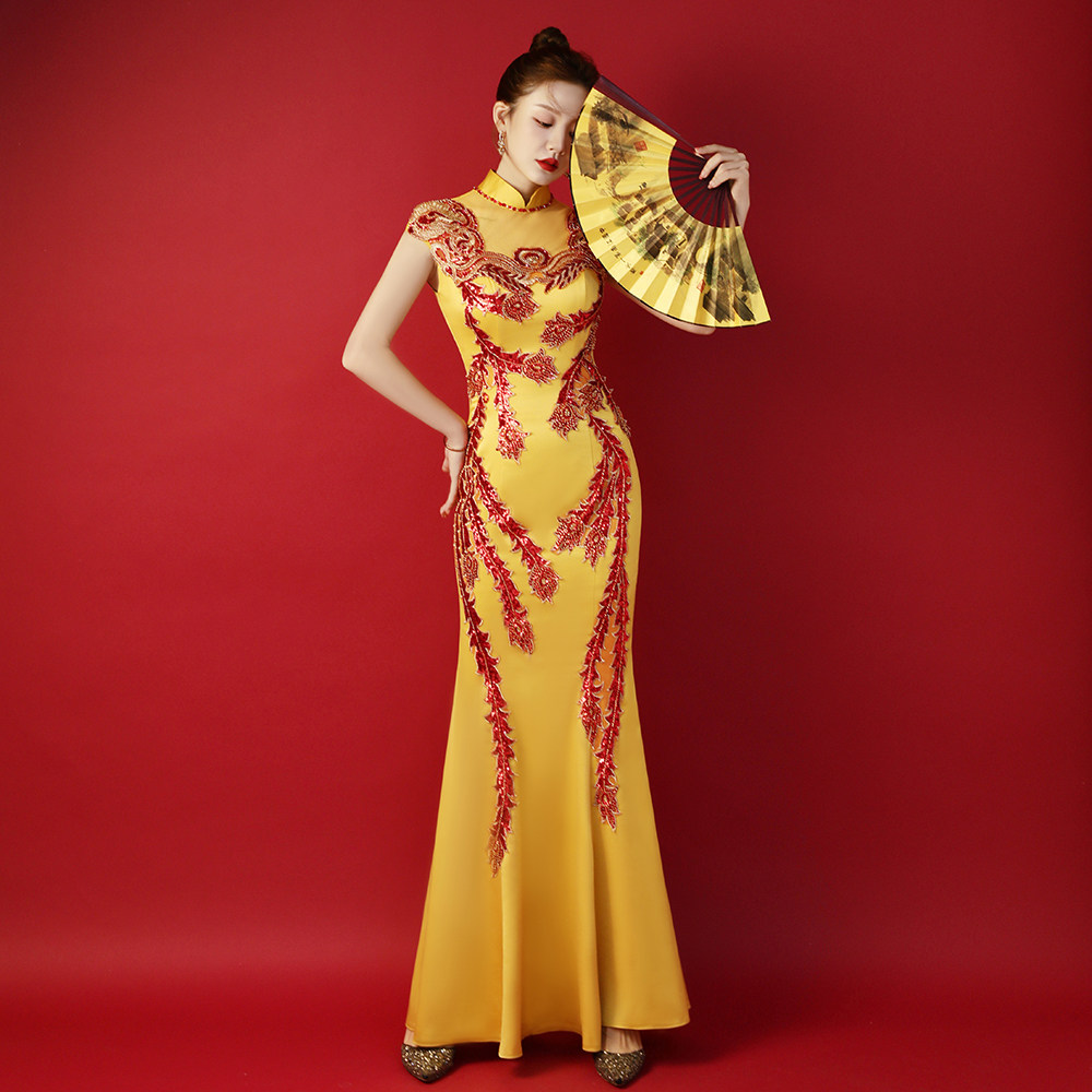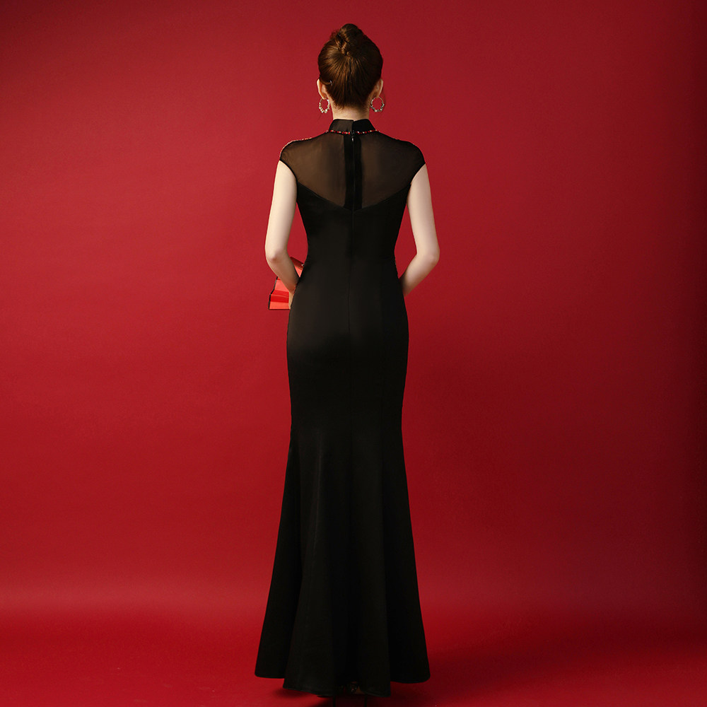 紫缘萱高档黑色晚礼服重工绣花T台走秀表演出节目主持修身鱼尾裙