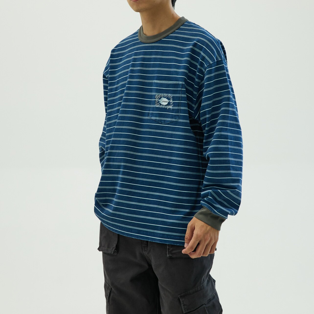 【极限清仓】LAPRIMA 条纹长袖圆领水洗做旧破坏日系复古T恤秋